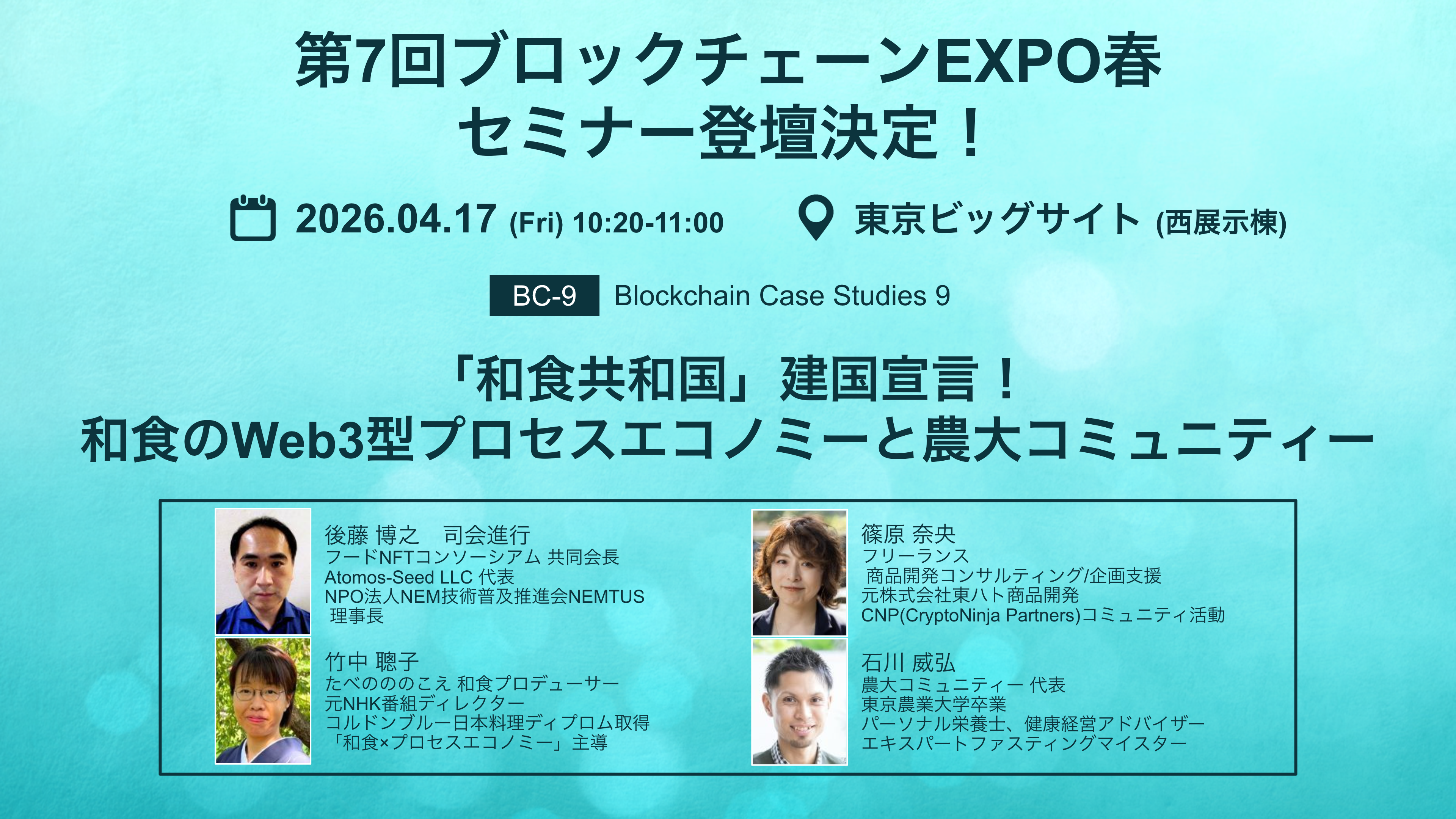 最初の実例となる「和食共和国」について、2026年4月17日(金)ブロックチェーンEXPOにてセミナー登壇いたします。