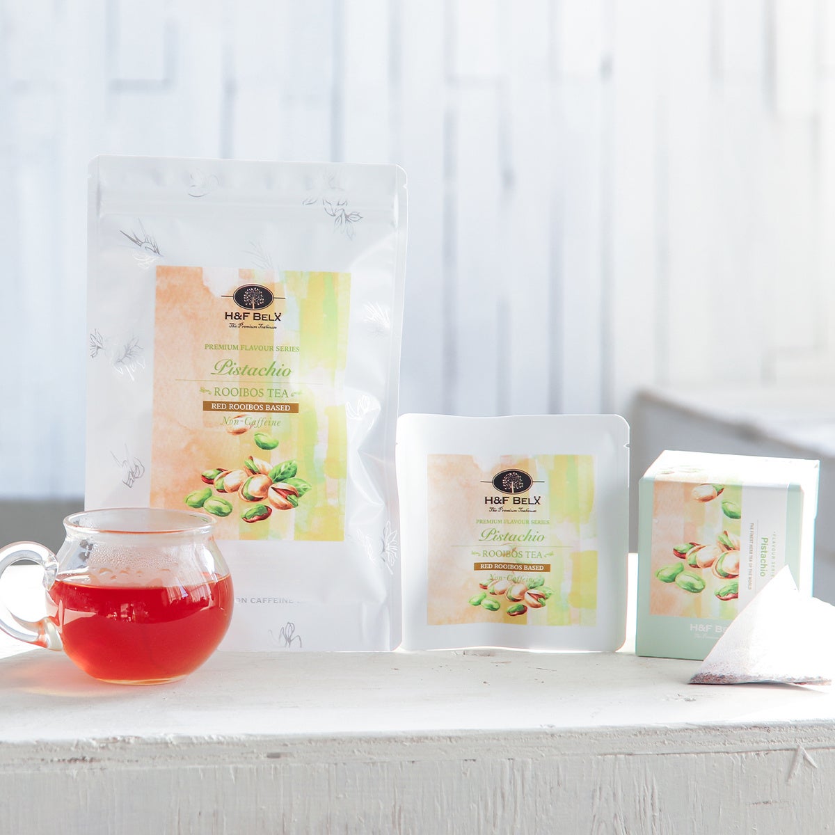 ピスタチオのこっくりとした甘み&香ばしい風味と発酵ルイボスの深いコクが引き立ちあうリッチで香り高い味わいのルイボスティー。お試しサイズから大容量まで3サイズ展開。