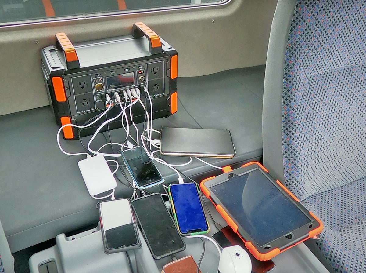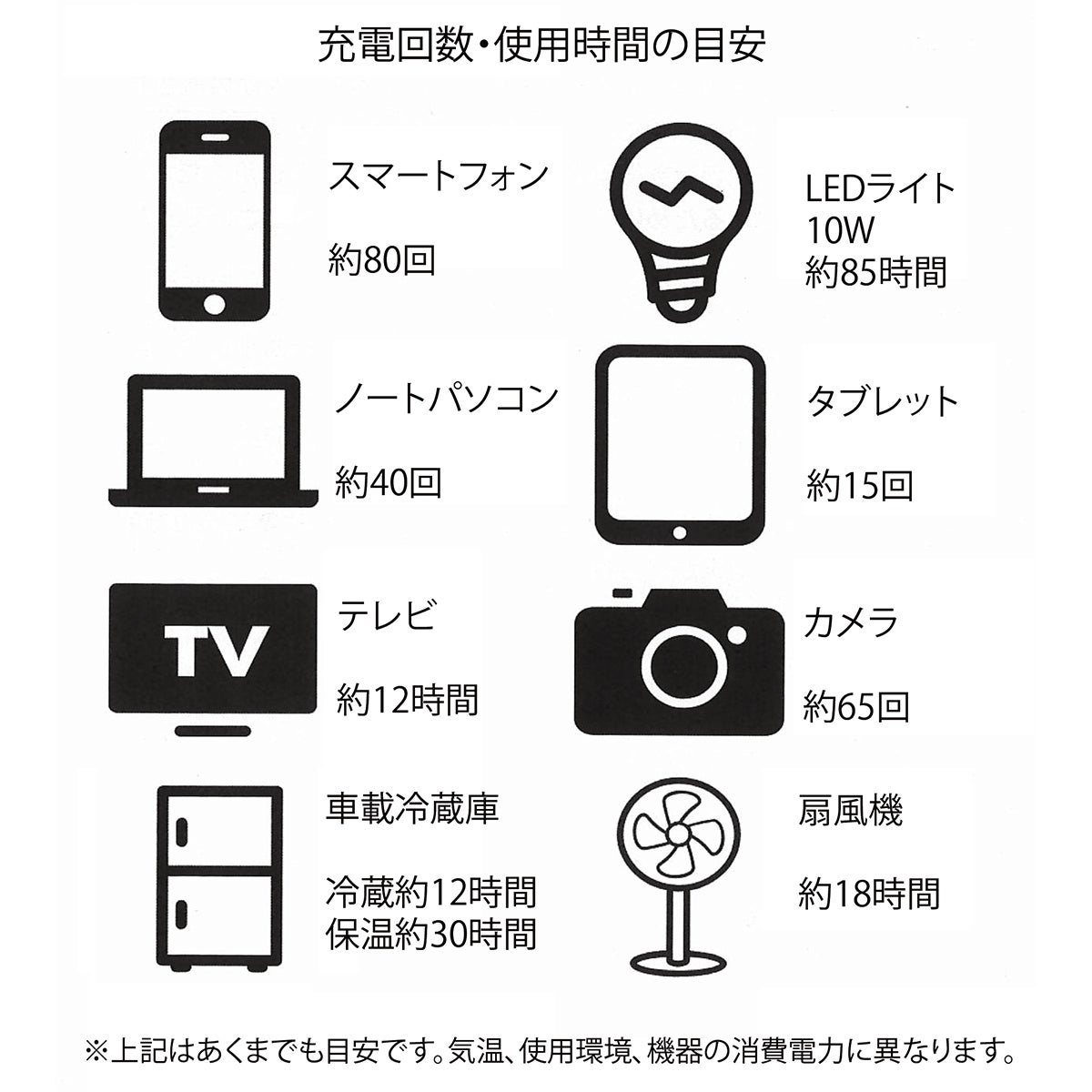 本機一台で、携帯端末はもちろん、車内やアウトドアで活躍するLEDライトや車載冷蔵庫(温蔵庫)、扇風機やパソコン作業時の電源確保も可能です。