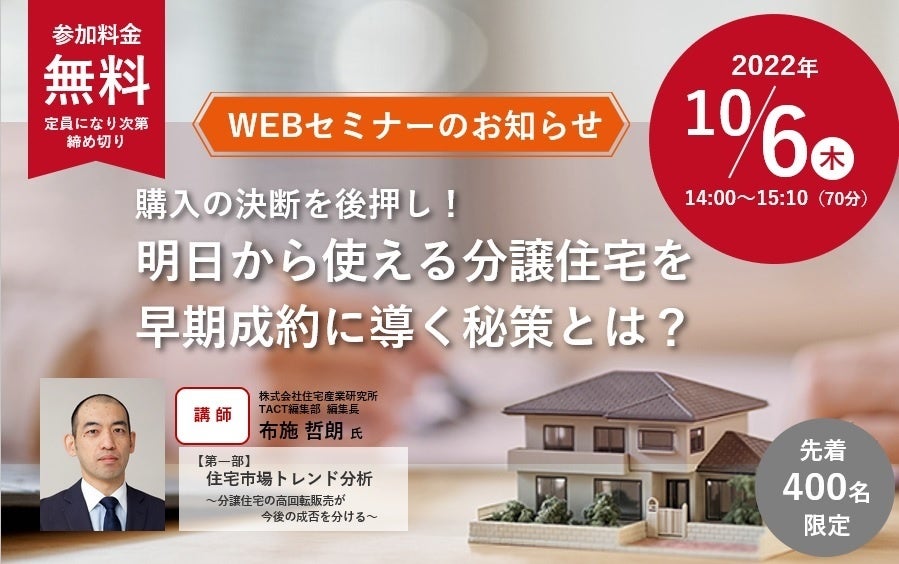 株式会社住宅産業研究所・TACT編集長を講師に迎え、これから住宅購入適齢期に差し掛かるZ世代に向けた、分譲住宅を高回転で販売する販促施策を、最新住宅事情を交えてわかりやすくお伝えします。