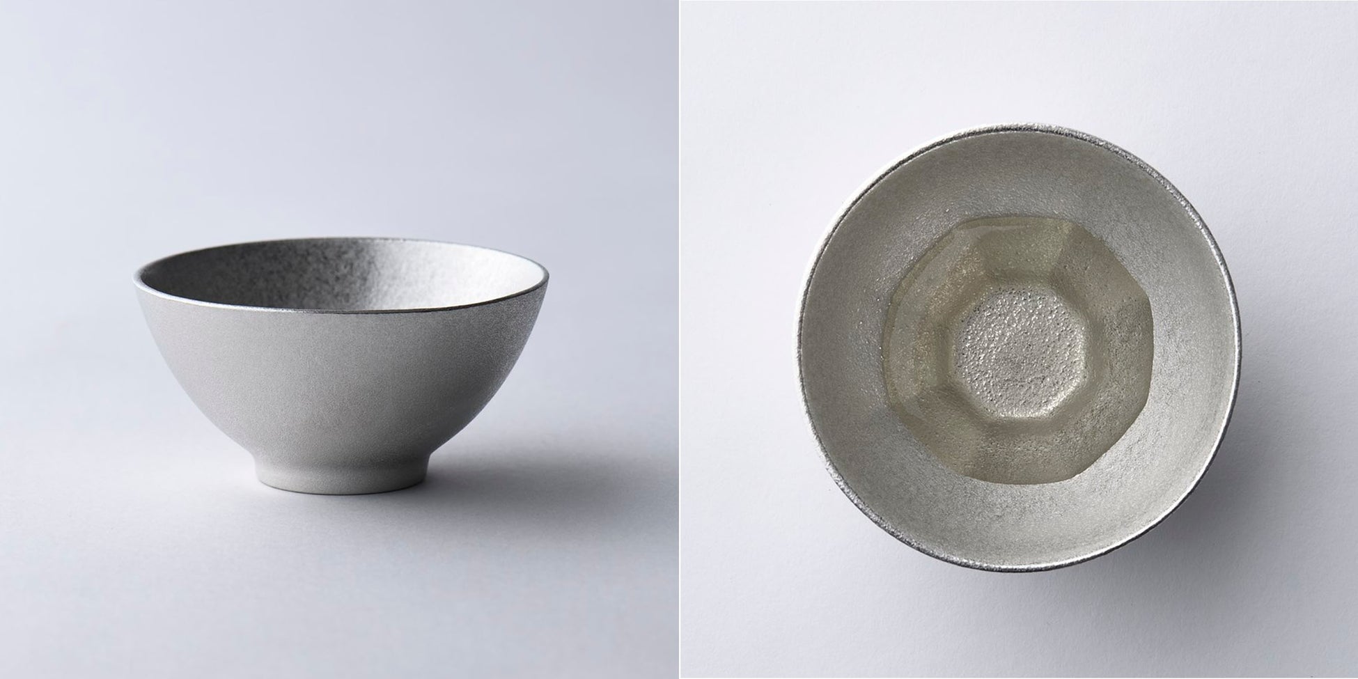 鋳錫 吉祥紋酒器(ちゅうすず きっしょうもんしゅき)は内側に吉祥文様を施した錫のぐい呑みです。お酒を注ぐと浮き立つ梅紋と八角紋の吉祥文様が楽しい食事と会話を演出します。