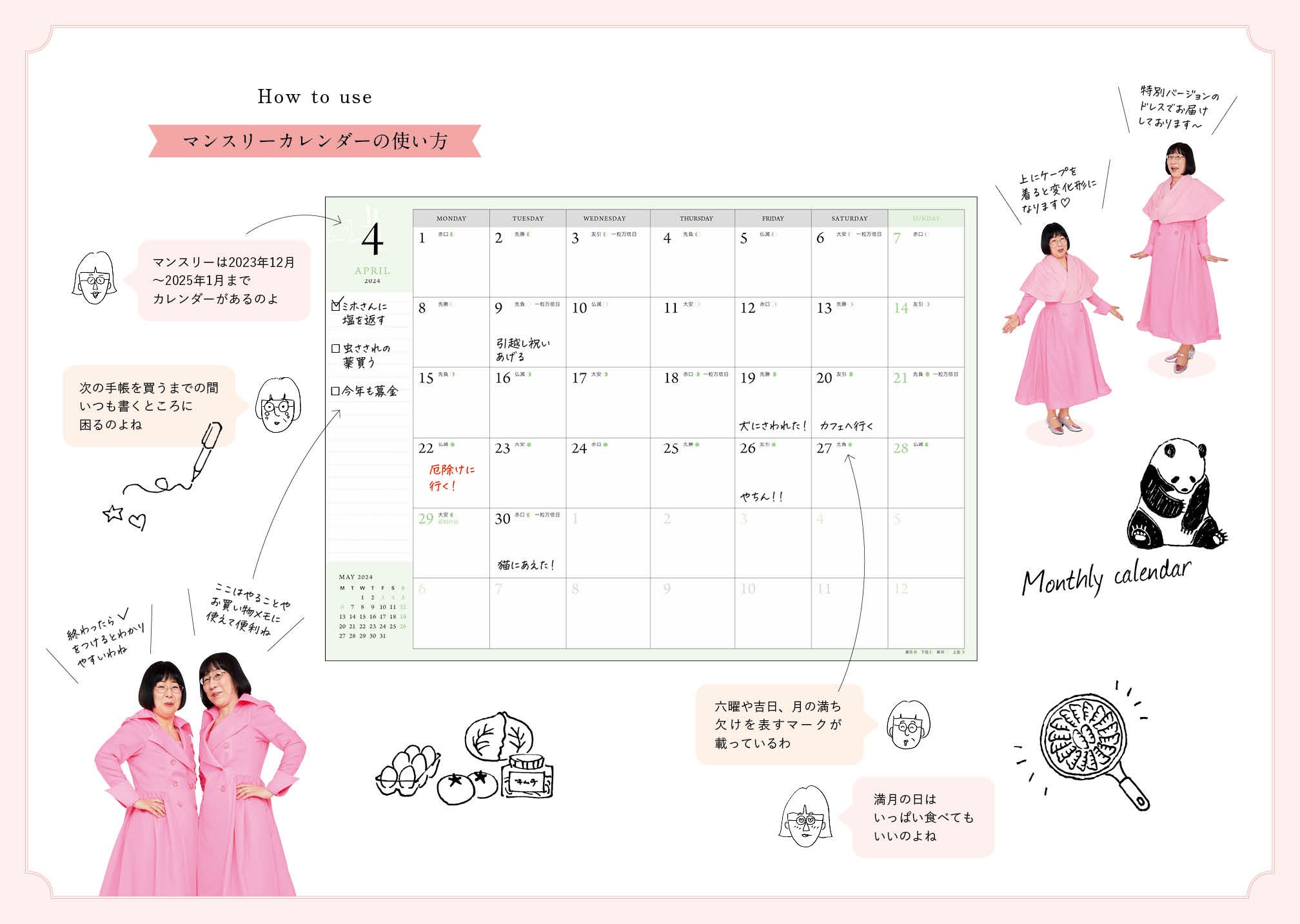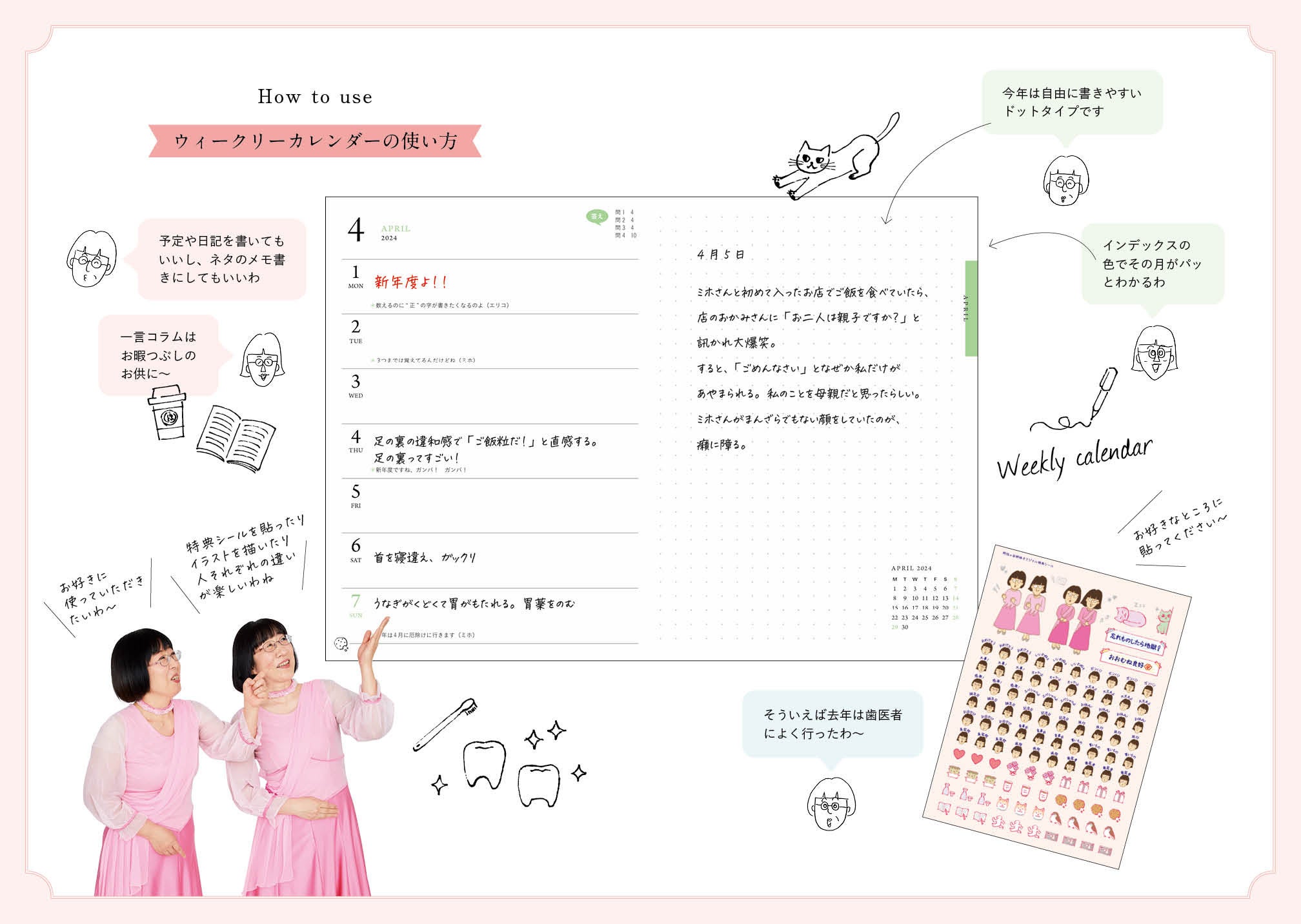 昨年発売した2023年版の手帳では、「なんだこの手帳! 気になる!」「阿佐ヶ谷姉妹らしいゆるさがいい!」「おおむね良好で一年がんばれそう」「小ネタがおもしろい&機能性もいい!」と使用者の方々から嬉しい声がたくさん届きました。そこで、今年はアンケート調査をもとにファンのみなさまの声を反映し、さらに使いやすく、楽しい手帳をつくりました。ありのままの自分を楽しむヒントや、おばさんゆえの気配り、くすっと笑えるおもしろい日常の数々がさらにギュギュっと詰まった一冊を一年をとおしてお楽しみください。