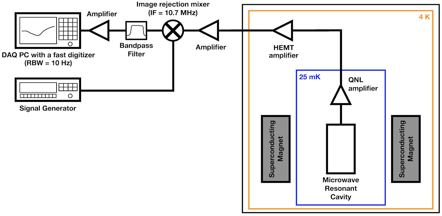 CAPPのリサーチフェローであるByeongRok Ko博士は次のように説明しています。「私たちの目標は、アクシオンハロスコープ検索の性能指数、すなわちスキャンレートを改善することでした。まず、DAQプロセスにオンライン高速フーリエ変換(FFT)が含まれる場合、単一チャネルで99%を超える実用的なDAQ効率を実現しました。次に、IQミキサーと2つの並列DAQチャネルを使用して、DAQ効率を損なうことなくソフトウェアベースのイメージ除去を実装しました。これにより、従来のスペクトラムアナライザを使用していた初期の実験装置に比べ、効率が2倍以上アップしました」
