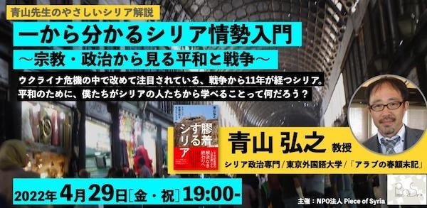 「シリアをまた行きたい国にする」をモットーに活動するNPO法人Piece of Syria(代表 中野貴行、以下「Piece of Syria」)は、2022年4月29日(金)に、現代東アラブ地域の政治、思想、歴史を専門とする東京外国語大学の青山 弘之教授を招いて、オンラインイベント「一から分かるシリア情勢入門〜宗教・政治から見る平和と戦争〜」を実施いたします。