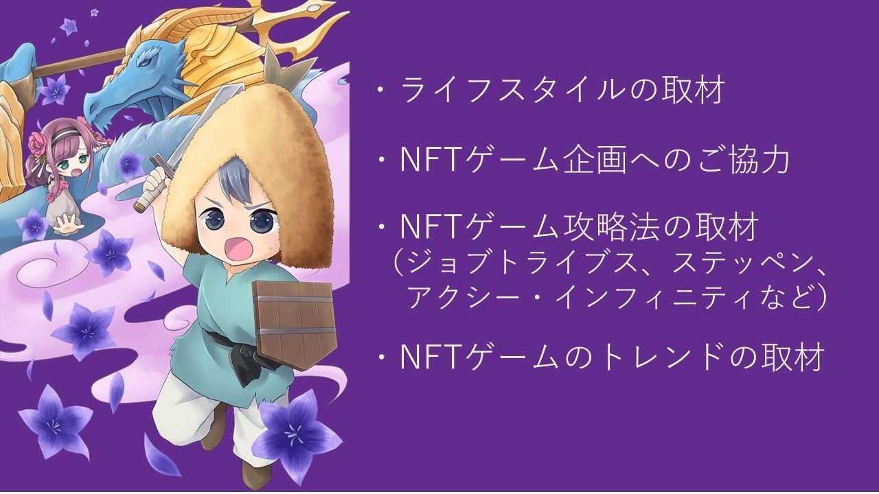 このような企画以外にも、「ライフスタイルの取材」「NFTゲーム企画へのご協力」「NFTゲーム攻略方法の取材」「NFTゲームのトレンドの取材」など、NFTゲームの魅力を伝えるための企画であれば、幅広く対応しています。