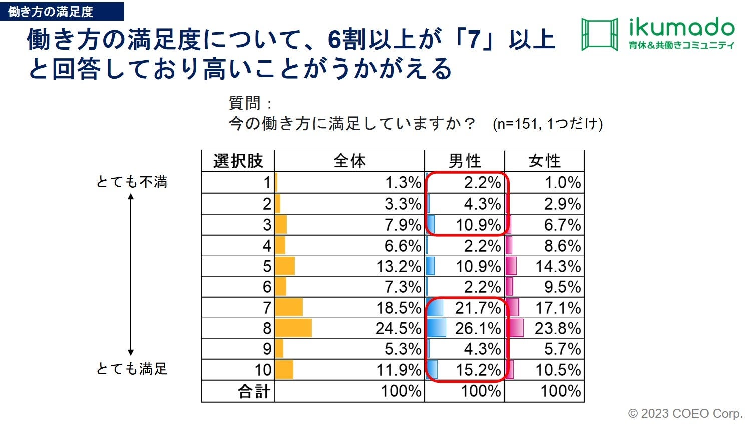 「今の働き方に満足していますか」という問いに対して、7以上である「満足」と回答した人は6割以上で、全体的には満足度が高いことがうかがえます。男女別にみると、男性は満足度が高い層と低い層の二極化していることがわかります。