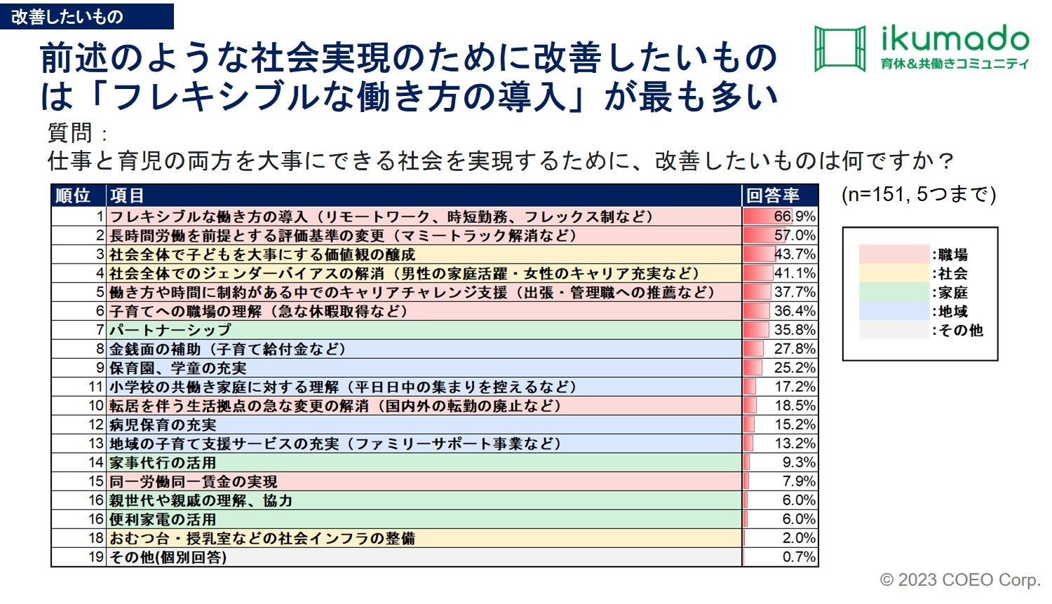 共働き世帯が、仕事と育児の両方を大事にできる社会実現のために改善したいもの1位は「フレキシブルな働き方の導入」