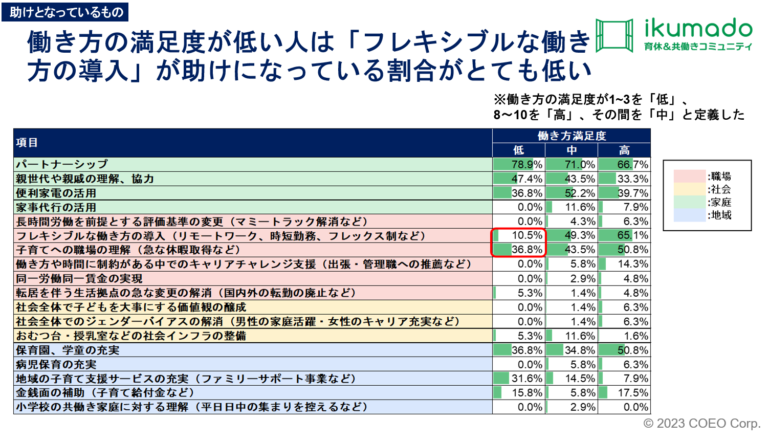 また、「子育てへの職場の理解」も低くなっており、働き方の満足度と職場の環境が関係している可能性が高いことがわかりました。