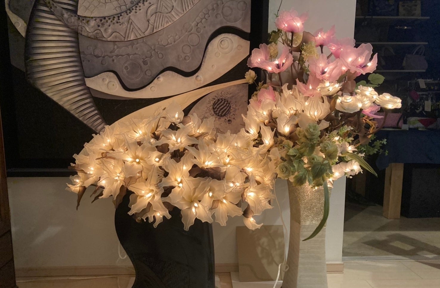 フラワーライトの商品にさらにアーティフィシャルフラワーを組み合わせたアレンジメントを手がけることで、よりアート性や幅広い世界観の表現性を叶えました。