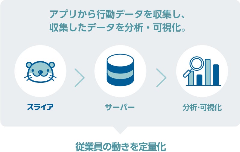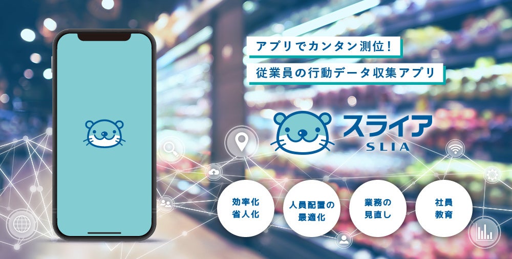 スマートフォンに「スライア」をダウンロードすることで、従業員の行動データを収集することが可能となり、各企業様は現場の「効率化・省人化」、「人員配置の最適化」といった課題解決にお役立ていただけます。