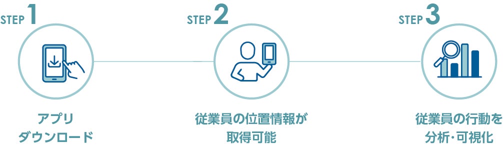 「店舗」「施設」などで従業員がアプリを起動したスマートフォンを持ち歩くだけで、行動データの収集が可能になります。