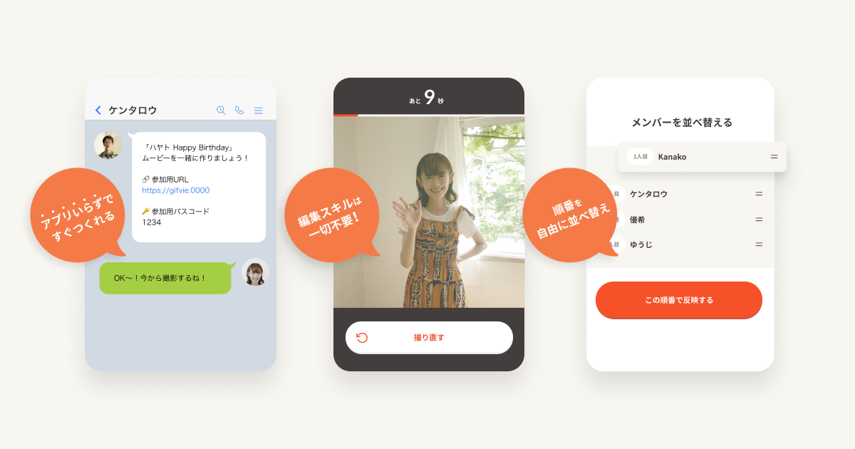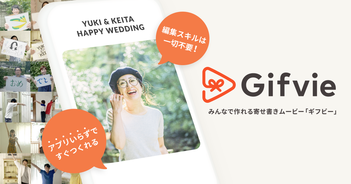2021年9月にローンチした「Gifvie」(読み:ギフビー)は、メッセージ動画をスマホで自撮りするだけで、複数人でのメッセージムービーを編集いらずで作成できるサービスです。幹事の進行管理や、編集スキル、専用アプリは一切不要。伝えたい想いさえあれば、3ステップで簡単にムービーを作成できます。結婚、出産、誕生日のお祝いや、職場の送別会、卒業式など、幅広いシーンでご利用いただけます。https://www.gifvie.com/ja/