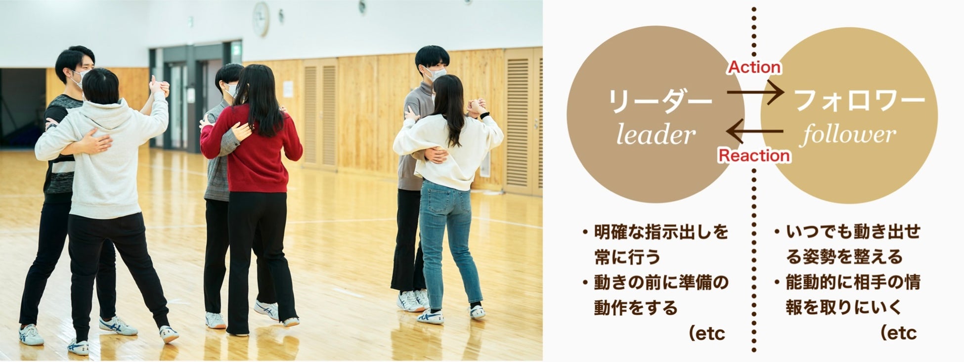 • 心理的アプローチ: 社交ダンスの本質である「リード&フォロー」を体感することで、相手を尊重しつつ自律的に動く「能動的なフォロワーシップ」を育成します。