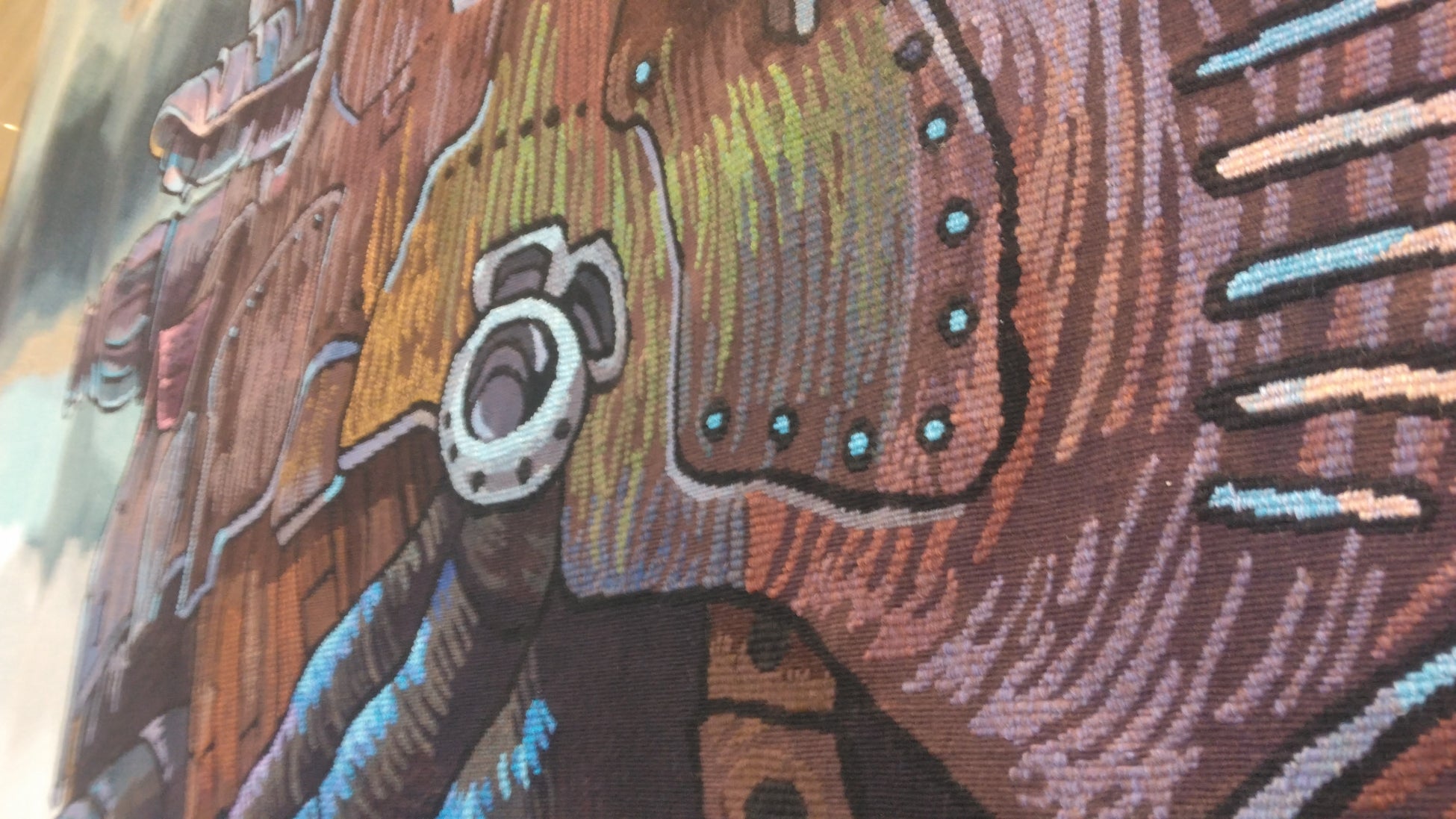 フランス中央部オービュッソンのタペストリーは、600年の伝統を誇り、国連教育科学⽂化機関(ユネスコ)の無形⽂化遺産にも登録されるなど、⻑い歴史と確かな技術を持つことで知られます。その織物⽂化を保存し広く伝える⽬的で発⾜したオービュッソン国際タピスリー(タペストリー)センターは、《オービュッソン、宮﨑駿の空想世界をタピスリーに織る》プロジェクトを進めています。これまで「もののけ姫」「千と千尋の神隠し」「ハウルの動く城(2点)」の計4点のタペストリーが完成しており、今後、「⾵の⾕のナウシカ」「となりのトトロ」の2点が製作される予定です。
