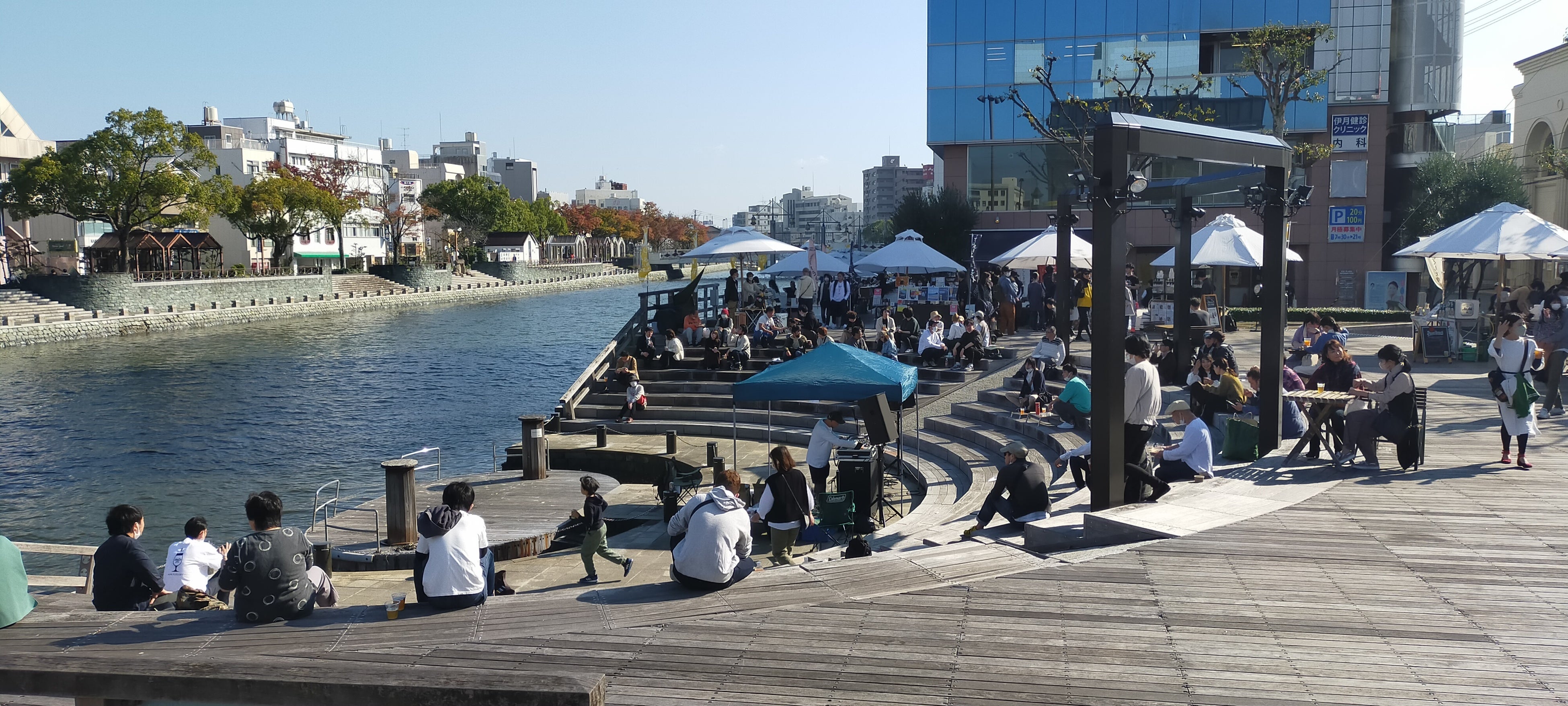 水際公園の対岸、木のぬくもりが優しい「しんまちボードウォーク」はいつも様々なイベントで賑わっています。