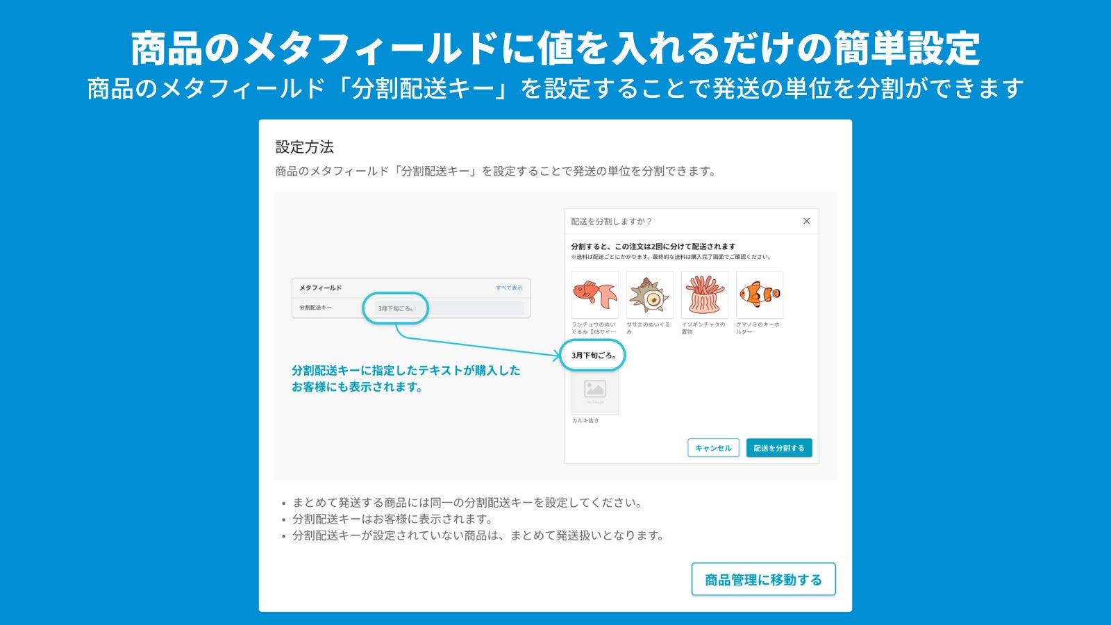 予約販売の場合は発送まで数ヶ月かかってしまうこともあるため「配送が分かれてもいいので、配送手配ができた商品から早く届けてほしい」という顧客のニーズに対応できるように、オープンロジはShopifyアプリ「注文分割」を開発し、事業者が商品の入荷時期に応じて注文を分割し、配送管理できるようにいたしました。