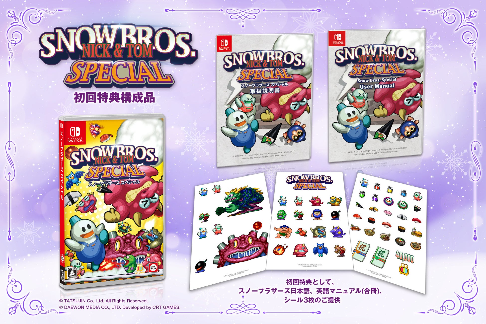 今回、パッケージ通常版の初回限定特典が公開されました。マニュアル本やオリジナルシール3枚など「スノーブラザーズ スペシャル」だけの可愛らしさと感謝を込めた皆様へのプレゼントです。