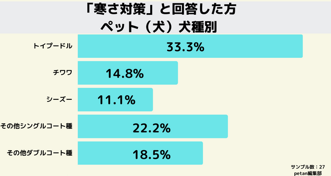 「寒さ対策」と回答した方のペット(犬)の犬種をみてみると、シングルコートのトイプードルが33.3%、その他シングルコート種が22.2%とシングルコート種が半分以上を占める結果となりました。