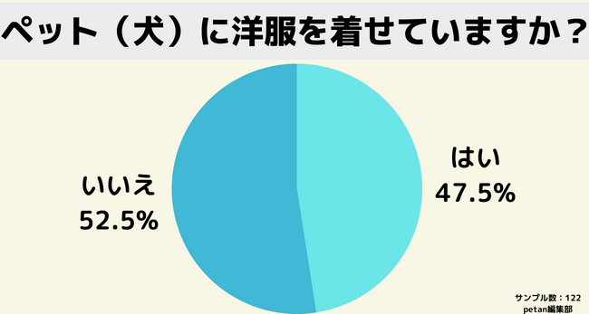 「はい」と答えた方は47.5%、「いいえ」と答えた方は52.5%という結果に。約2人に1人はペット(犬)に洋服を着せていることがわかります。