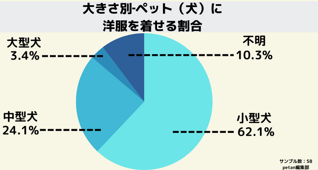 また、「小型犬・中型犬・大型犬」別でみてみると、小型犬(62.1%)、中型犬(24.1%)、大型犬(3.4%)、不明(10.3%)という結果に。中型犬、大型犬も洋服は着ているものの、圧倒的に小型犬が多いということがわかりました。