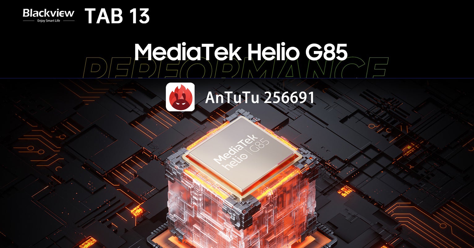 Blackview Tab13はオクタコアSoCであるHelio G85と6GBのメモリとeMMC5.1のストレージを搭載。Antutuベンチマークの公称値は約25万点と、エントリークラスのスコアです。