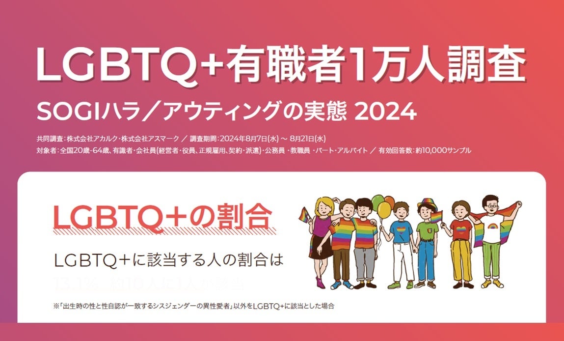 2024年8月に株式会社アスマークと共同で有識者1万人に対して、「職場におけるSOGIハラスメント・アウティングに特化したLGBTQ+の調査」を行いました。