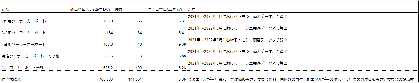 | ソーラーカーポート合計 | 628.2 | 100 | 6.28 | 2021年~2022年8月におけるトモシエ顧客データより算出 |