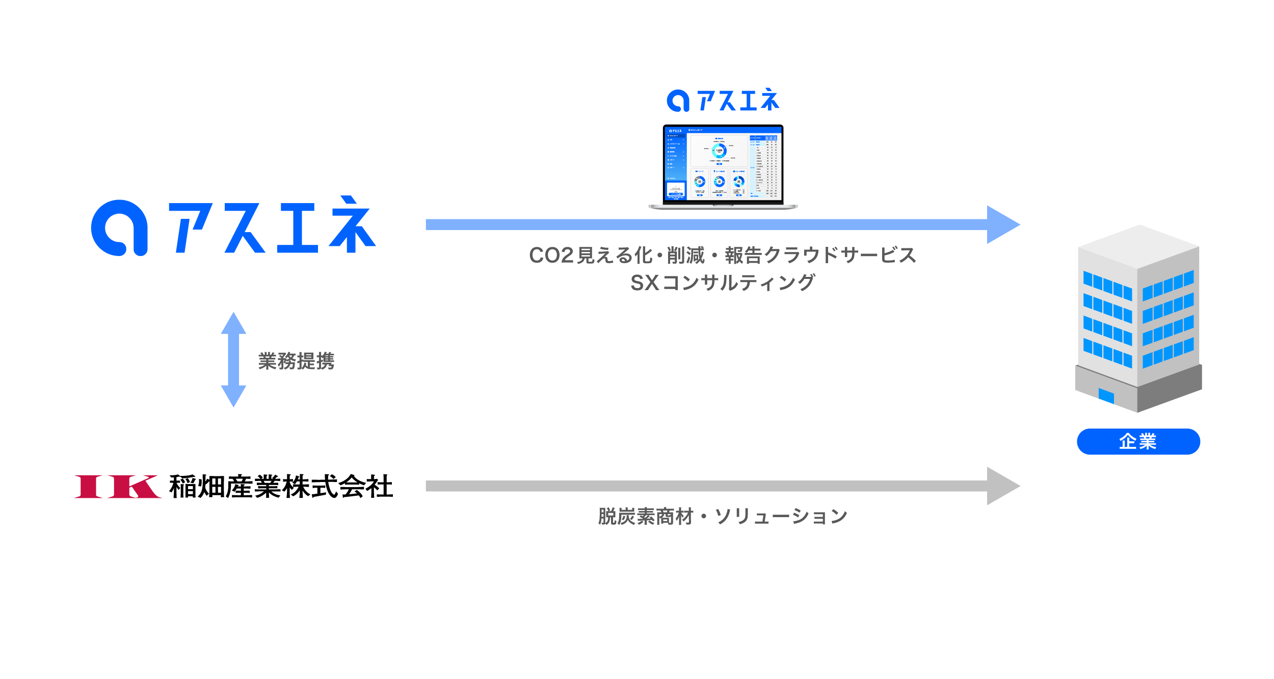 本業務提携により、稲畑産業とアスエネのソリューションを通じてCO2排出量の見える化・削減をワンストップで支援します。そして、取引先企業のさまざまな脱炭素経営のニーズに応え、カーボンニュートラル社会の実現に貢献してまいります。