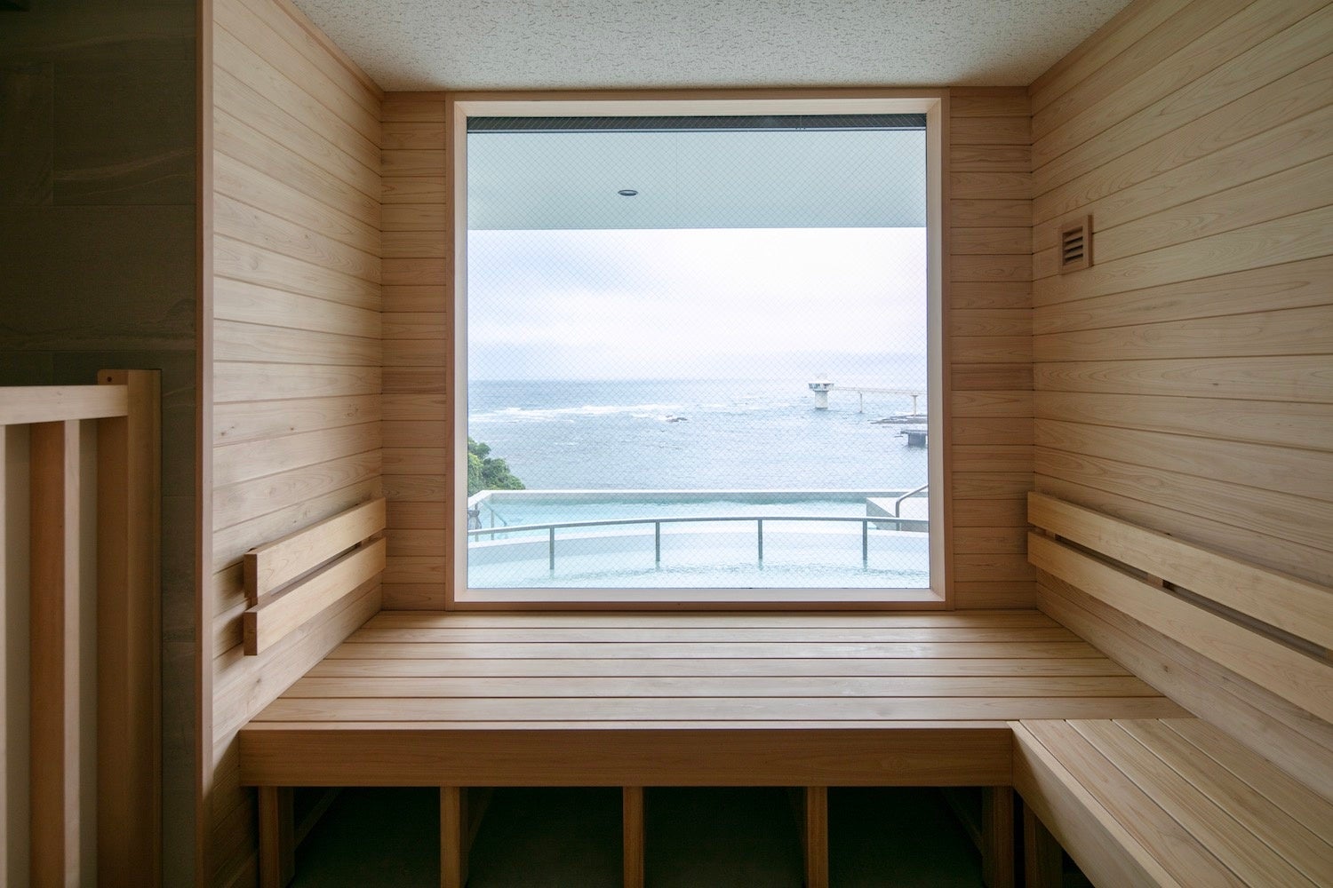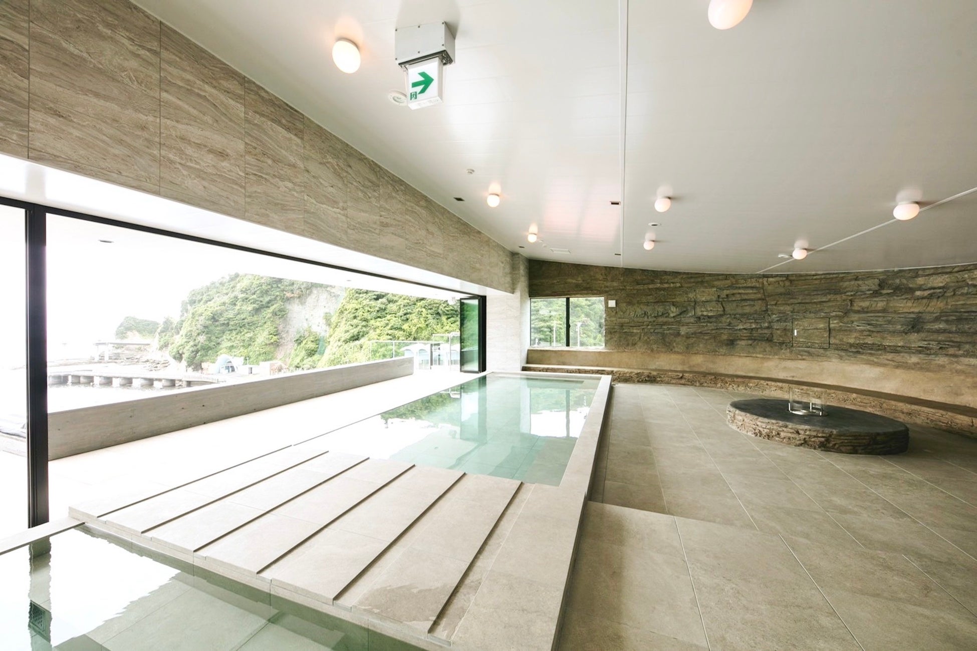 勝浦の海との一体感を演出するリアス式海岸の岸壁をイメージした空間には、勝浦の海を一望できるサーマルスプリングスパ(天然温泉スパ)や、サウナを完備。また、ゆったりお寛ぎ頂ける屋外ラウンジスペースもご用意します。