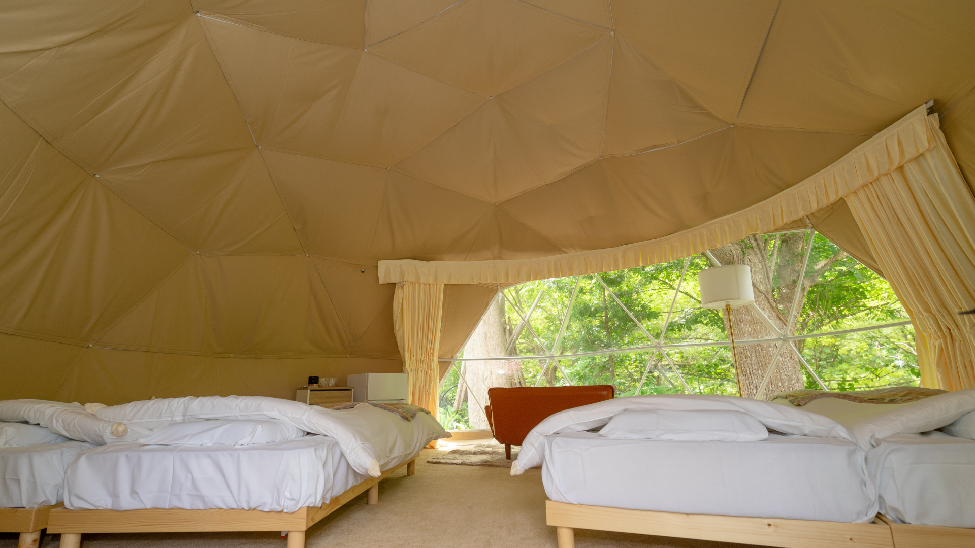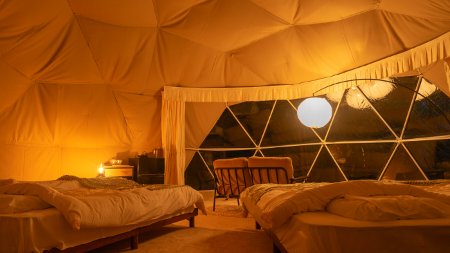 最大4名が宿泊できる直径6mのラグジュアリードームテントはスイスアルプスの山岳リゾートや、砂漠地のグランピング施設で採用されており、暑い夏でも寒い冬でも適応できることが実証されています。