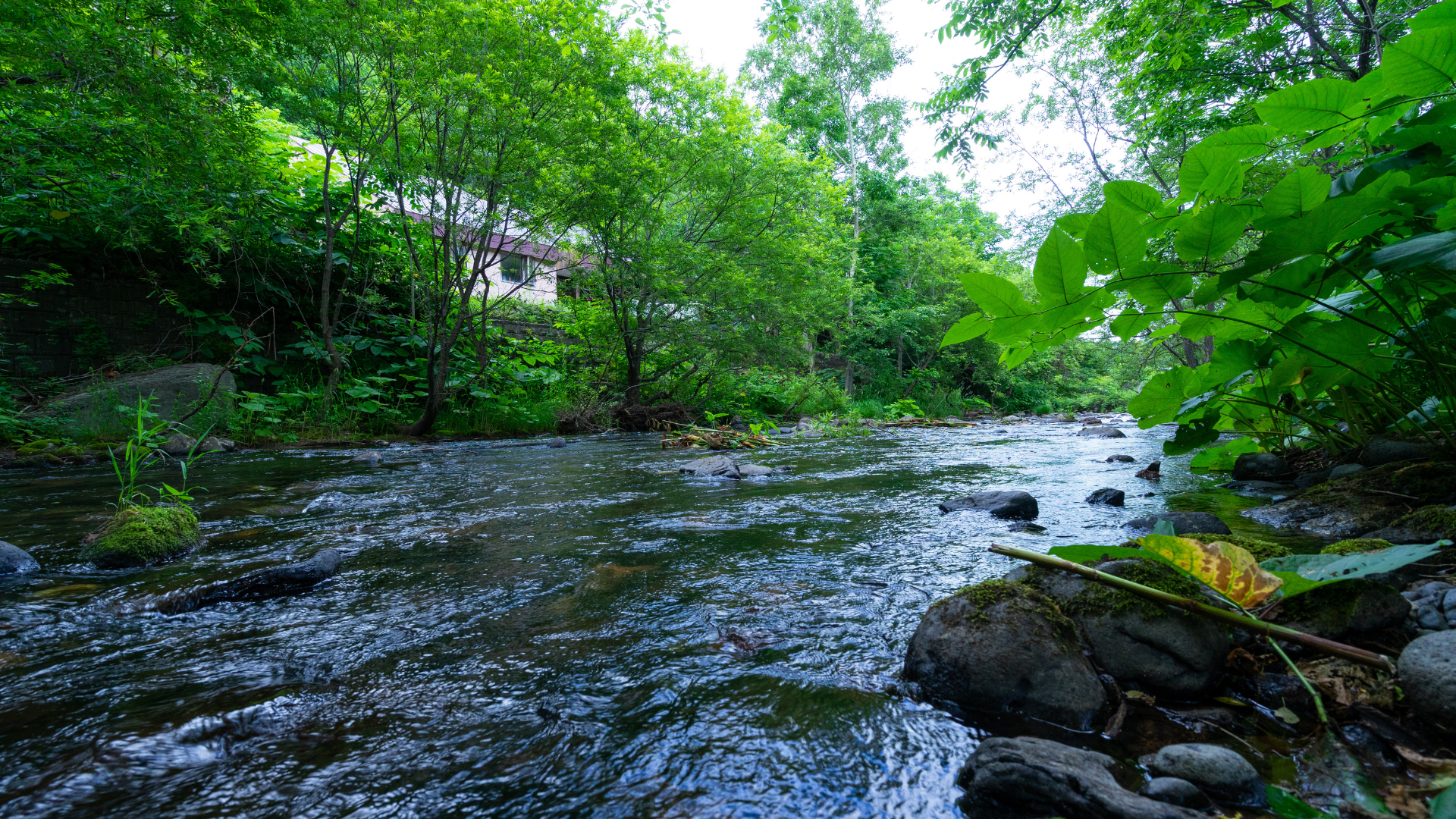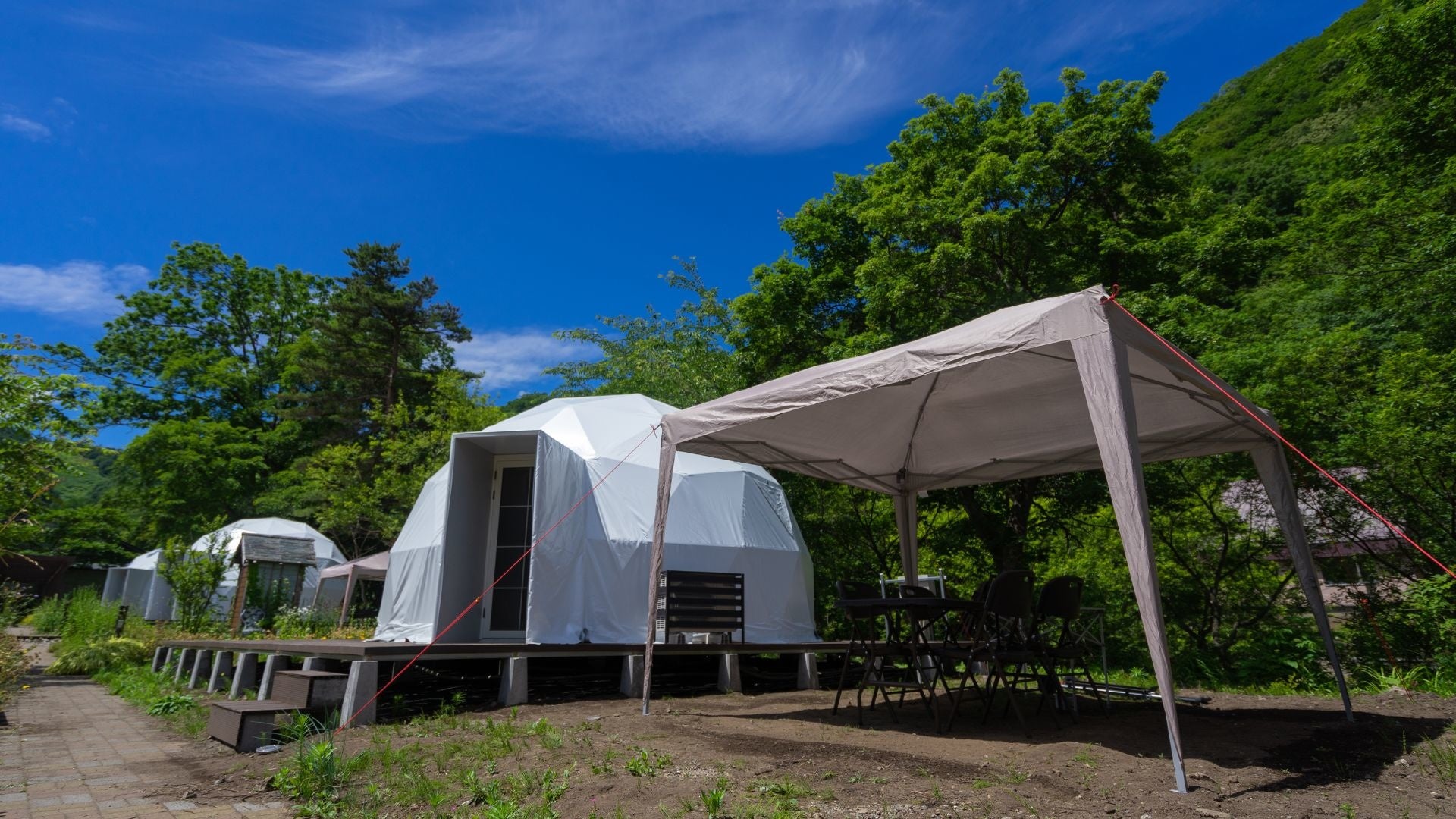 glampark小樽はなえみはドームのそばに透き通った朝里川が流れており、豊かな自然の中にあるグランピングが味わえます。