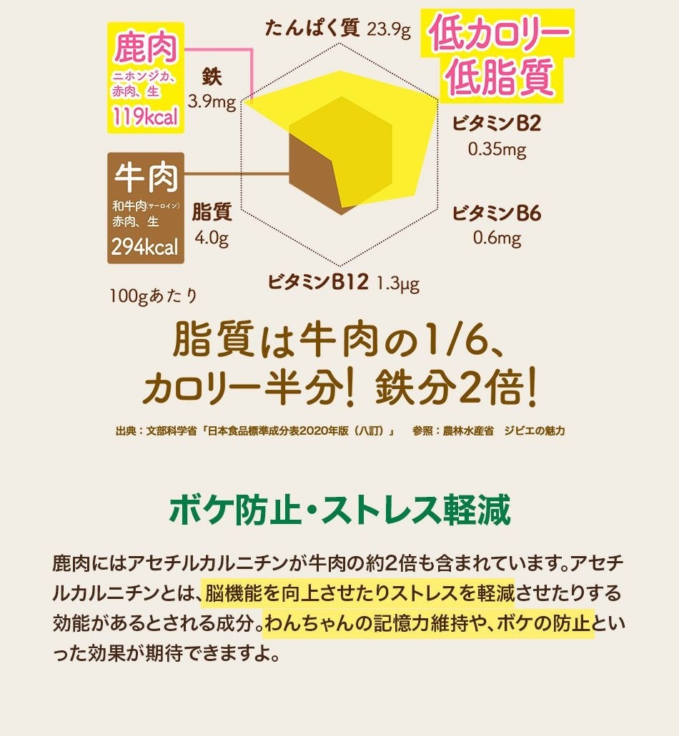 鹿肉は牛肉と比較するとカロリーは約2分の1、脂質も約6分の1にまで抑える事が可能であることに加え、タンパク質は約2倍含まれています。さらに鉄分やビタミン群も豊富で、運動不足のシニア犬にも健康的にダイエットが可能です。