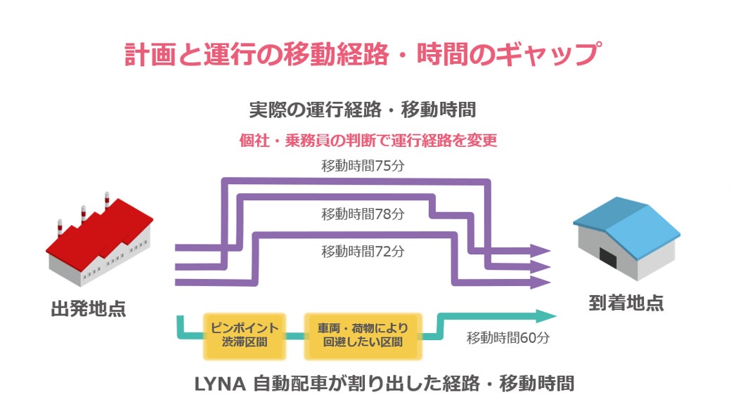 「LYNA 自動配車クラウド」は、配車計画の作成にあたって独自AIを搭載しており、車両台数や燃料費などの輸配送コストを重視した利益の出せる配車計画を高速で立案できる製品で、配車にかかる人材不足への課題解決にも寄与しています。一方で、ユーザーからは計画と運行実態で移動経路・時間に差があり、計画通り車両を運行することが難しいとの意見を頂くことがありました。これは運行時に計画で想定していない渋滞に遭遇したり、ユーザーが車両や荷物に合わせ遠回りでも安全な経路を選択するといった行動を取ることが原因の一つです。