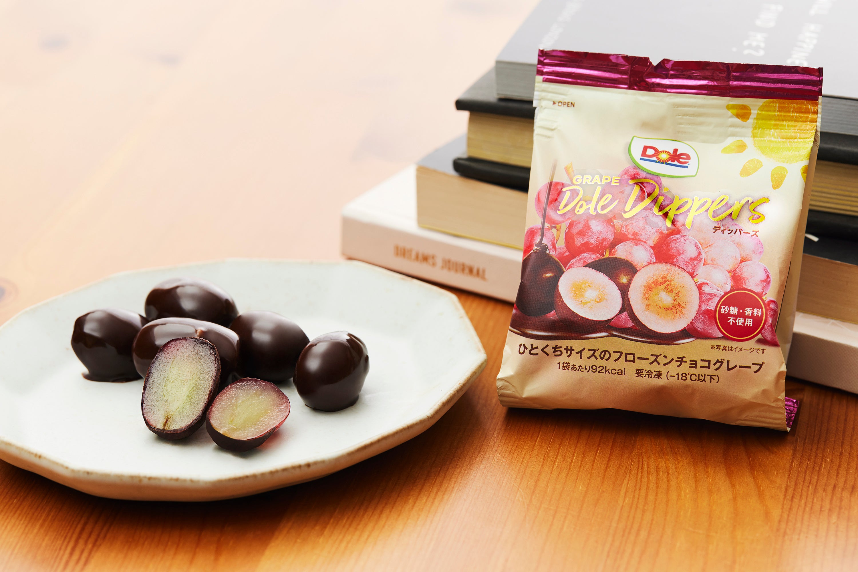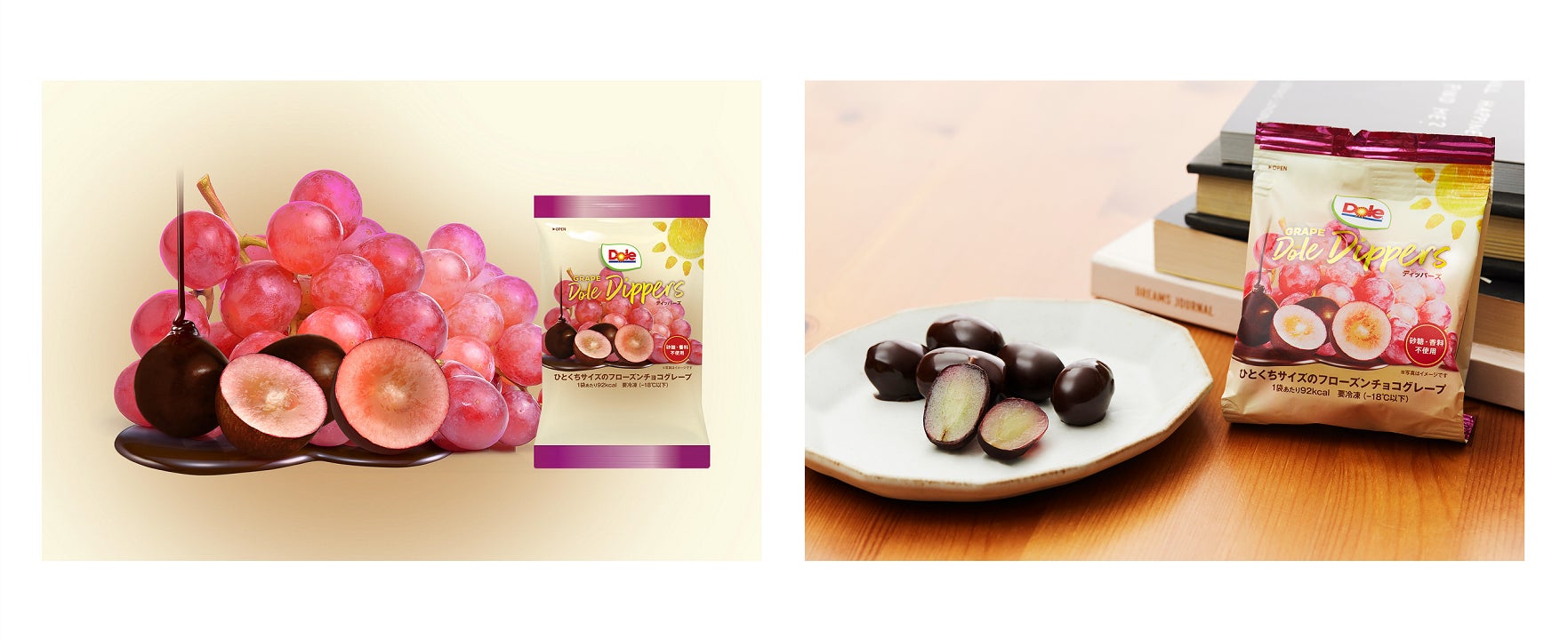 “Dole Dippers(ドール ディッパーズ)”は、2022年4月に日本に初上陸した全米で人気を誇る、冷凍生フルーツをチョコレートでコーティングした一口サイズのヘルシーフローズンデザートです。第一弾として、ドールの「スウィーティオバナナ*1」を厚めの輪切りにして、たっぷりのチョコレートでコーティングした『BANANA Dole Dippers(バナナ ドール ディッパーズ)』を発売し、好評を博しています。今回、第二弾として『GRAPE Dole Dippers(グレープ ドール ディッパーズ)』が登場します。種なし赤ぶどうをひと粒丸ごとチョコレートがけして凍らせた新商品です。ぶどうの濃厚な甘みを活かすため、チョコレートは砂糖や香料を使わずに仕上げました。甘みと酸味のバランスが良いぶどうのみずみずしさと、豊かなカカオの香りを一度に堪能できます。1袋92kcalの控えめなカロリーで、小腹が空いた時の間食や食後のデザート、夜のご褒美スイーツにもぴったりな、ギルトフリーでリッチなデザートです。