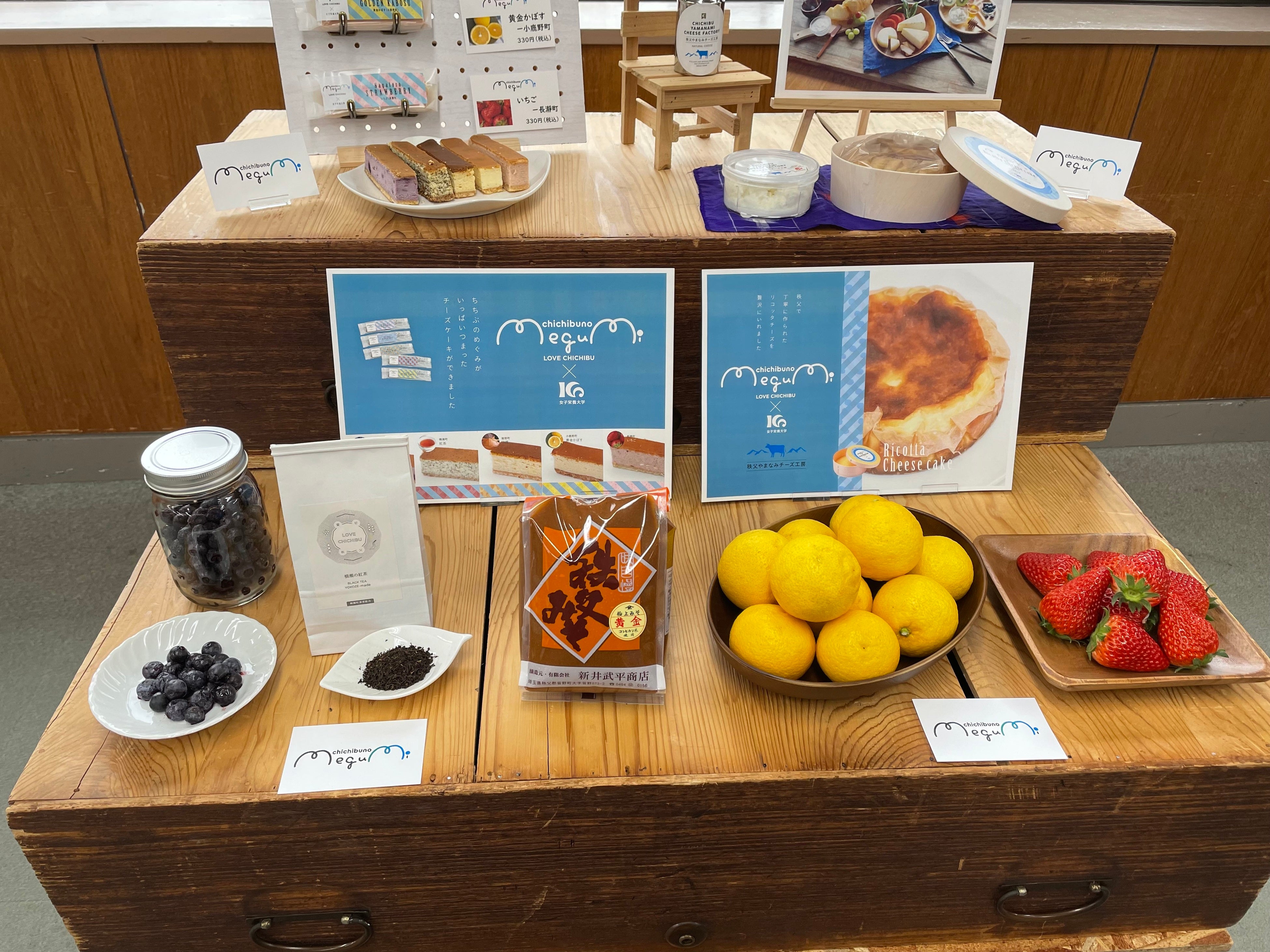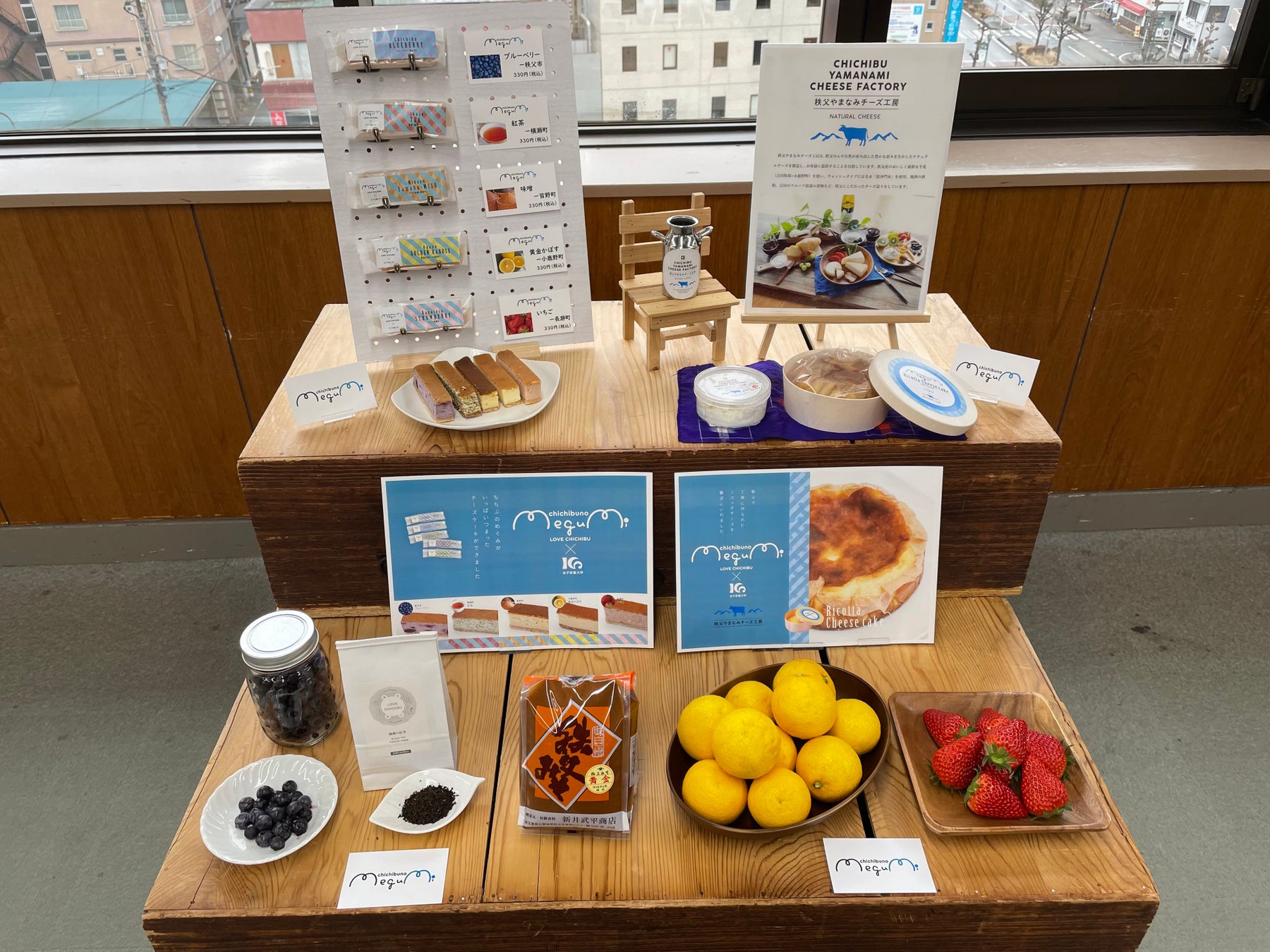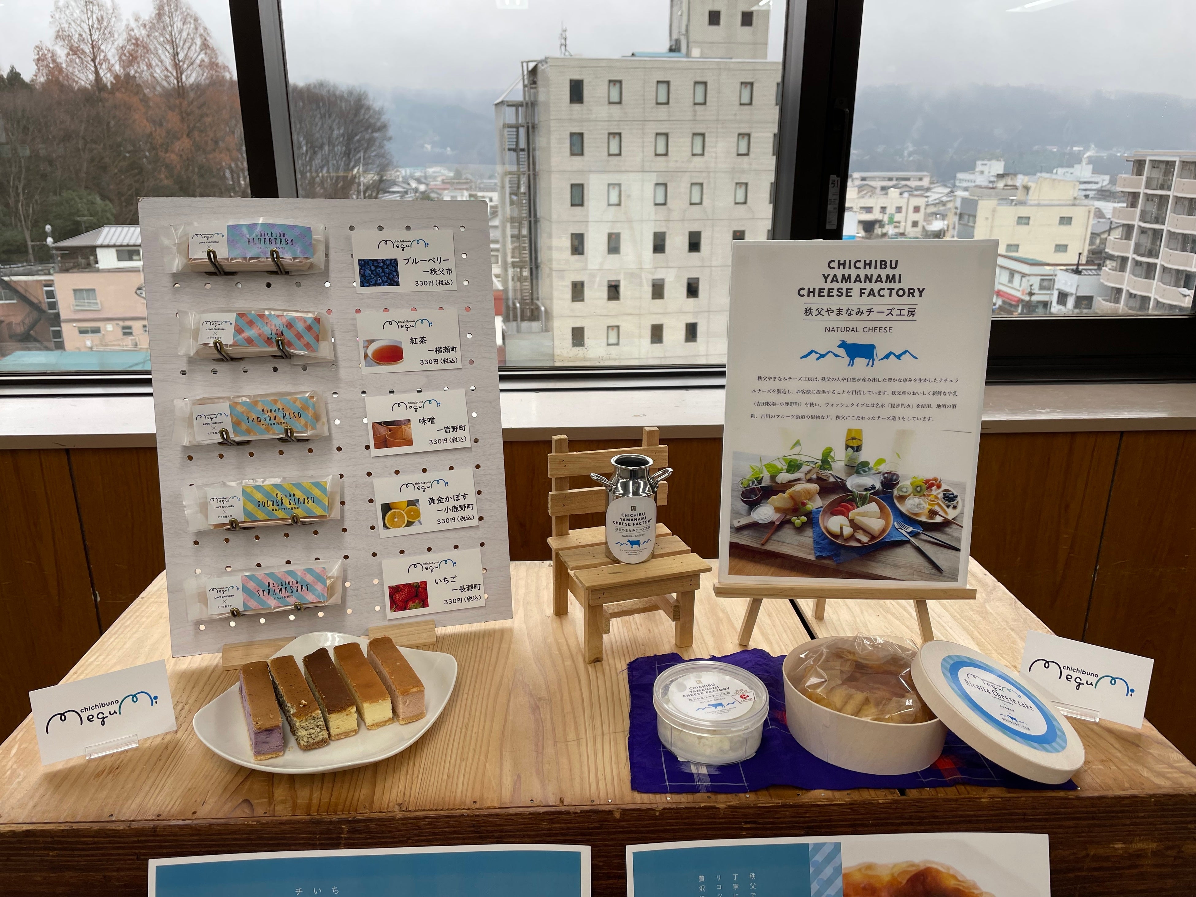 この事業の初年度、令和3年には水戸屋本店(秩父市)に協力してもらい、1市4町の食材(秩父市:ブルーベリー、横瀬町:紅茶、皆野町:味噌、長瀞町:いちご、小鹿野町:黄金かぼす)を使用した「スティックチーズケーキ」と秩父やまなみチーズ工房のリコッタチーズを使用した「リコッタチーズケーキ」を開発し、じばさん商店で販売するほか、期間限定で西武百貨店でも販売しました。