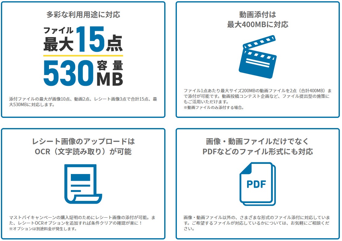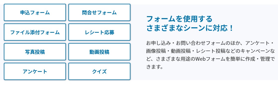 汎用性の高いフォームを作成できるため、お申込みフォームはもちらん、キャンペーン向けの応募フォーム(動画・写真、レシートの投稿)、企画書やデザインなどのコンテスト受付など、さまざまなシーンでご活用いただけます。