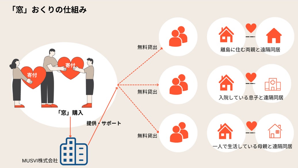 第1期として3組の方に、恩送りより半年間無料で「窓」を貸出し、離れていても一緒に生活をする遠隔同居を 『「窓」おくり』 として体験していただけます。