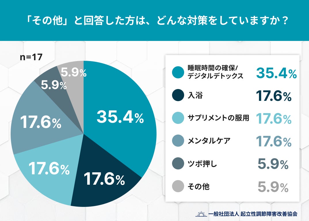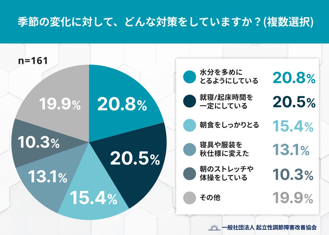 季節の変化への対策としては「水分を多くとる」「就寝・起床時間を一定にする」が2割超