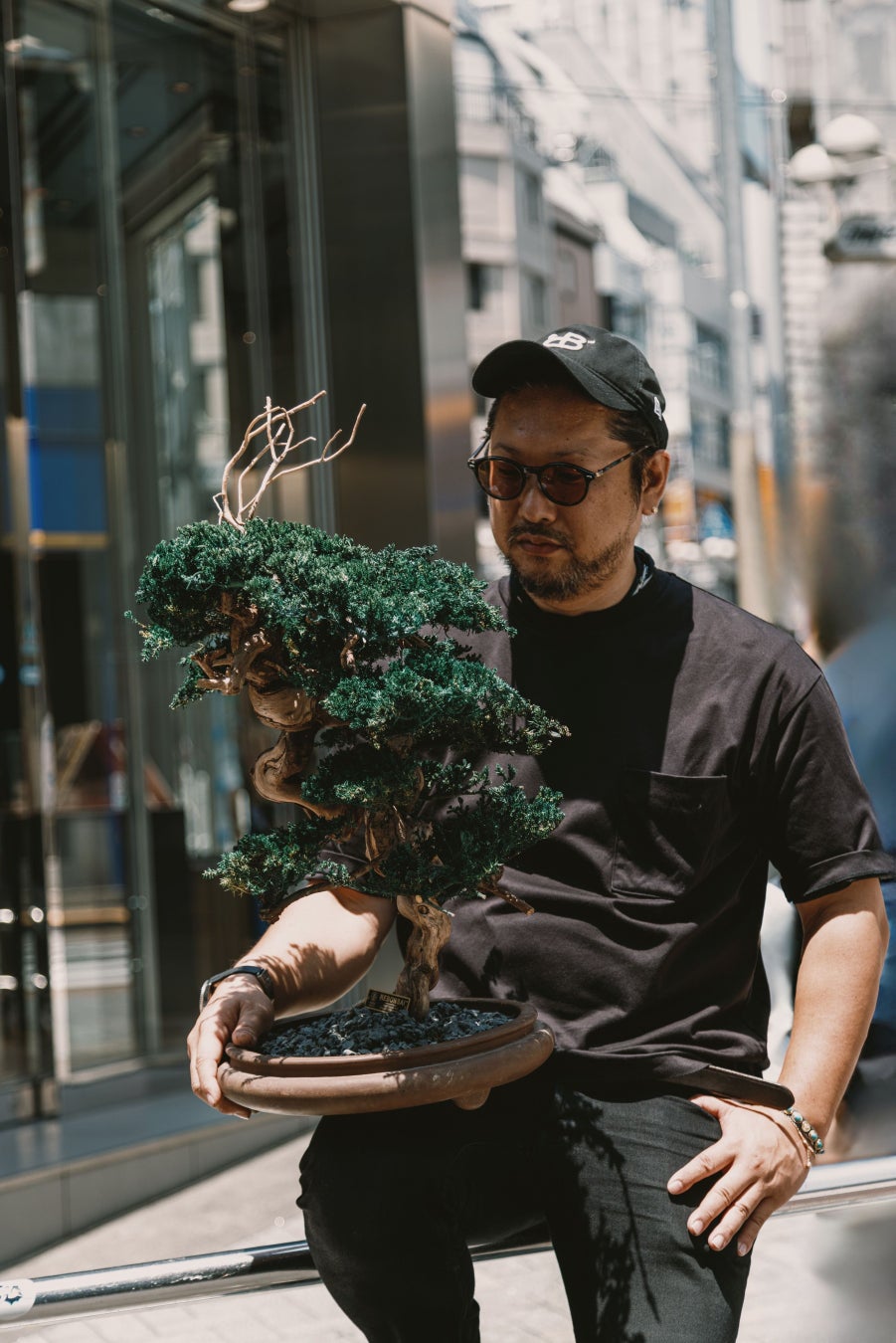 ファッションに敏感で、若い頃から渋谷を訪れ、スケートボードやサーフィン、スノーボードなどアクティブな趣味を持ちつつ、盆栽にも興味を抱いていました。彼のモットーは「カッコいいを追求し、やりたいことをカタチにする」こと。塗装業で色に魅了され、盆栽に出会うことで、異なる世界観を融合させた新たなアートを創造しています。