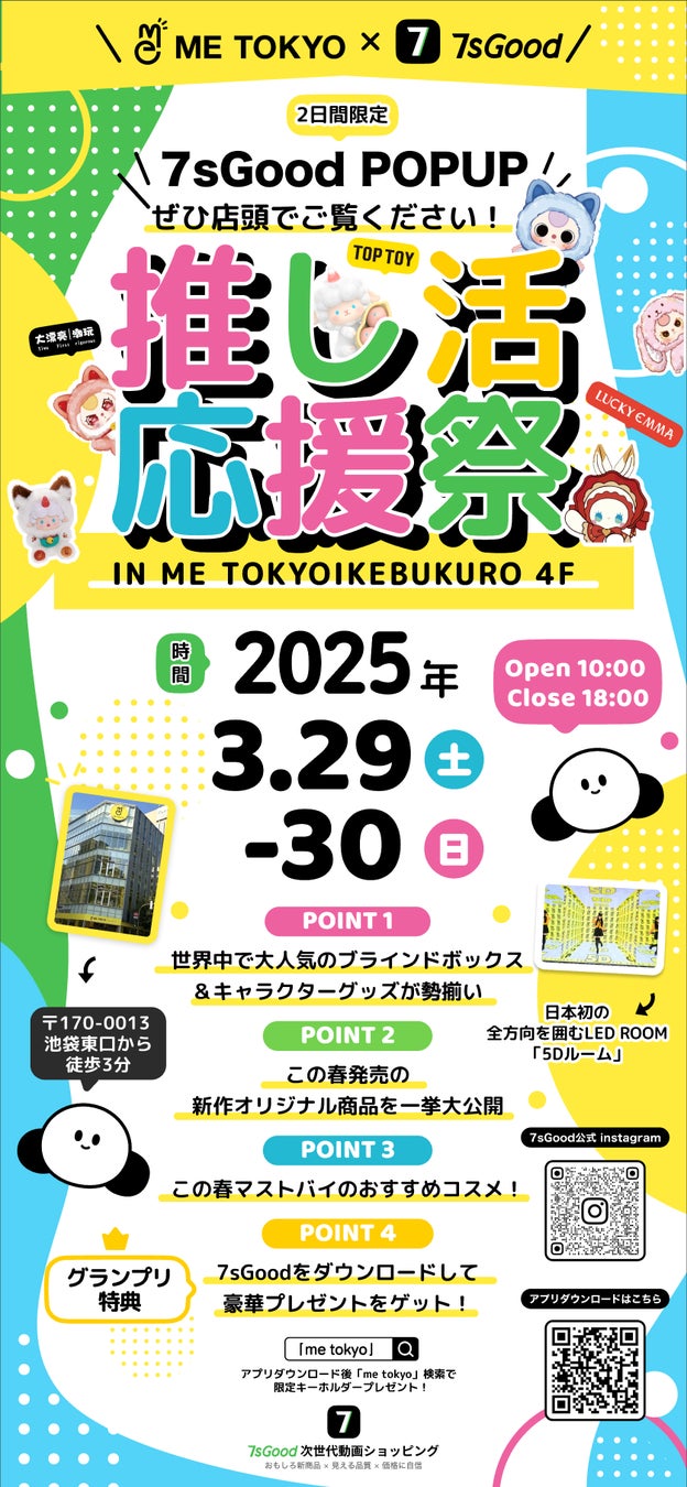 HHOグループが運営する越境ECプラットフォーム「7sGood(セブンズグッド)」は、TOPTOY、breo、INTO Uなどの国際ブランドと協力し、2025年3月29日(土)〜30日(日)の2日間、東京・池袋にある商業施設「ME TOKYO IKEBUKURO」にて「推し活応援祭」を開催します。Z世代を中心とした“推し活”文化を盛り上げるため、会場ではオリジナルグッズ制作体験や最新美容ガジェット体験など、3つのテーマブースを展開。さらにオンラインでのライブ配信と連携し、視聴者がリアルタイムで商品を購入できるライブコマースも実施します。月間来場者数約30万人(※)を誇る池袋の新スポットで、若者の熱気を最大限に引き出すことを目指します。