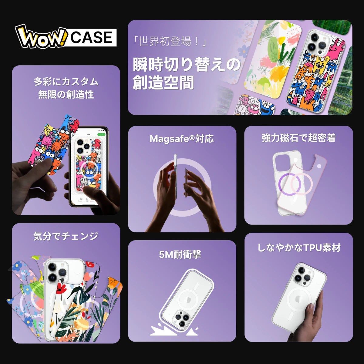 「私が創る、オリジナルの世界」をテーマに、スマホで作る簡単オリジナルグッズのサンプルを展示。デザイン入れ替え自在の新感覚スマホケース「WOWCASE」