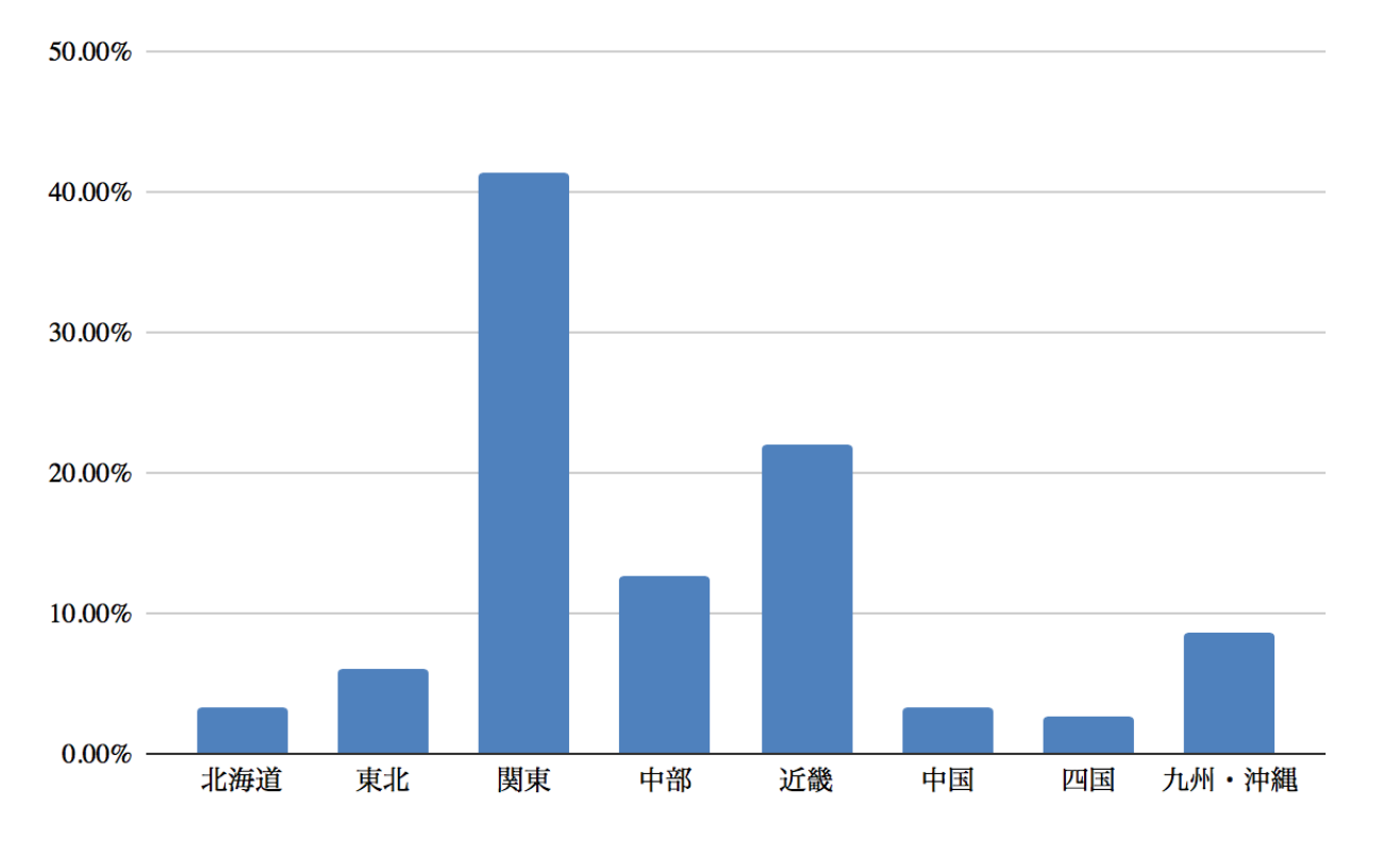 子供の通う中学校がある地域は、関東が一番多く、62人(41.3%)でした。続いて多いのは近畿の33人(22%)、中部19人(12.6%)でした。地域の詳細は以下のグラフの通りです。
