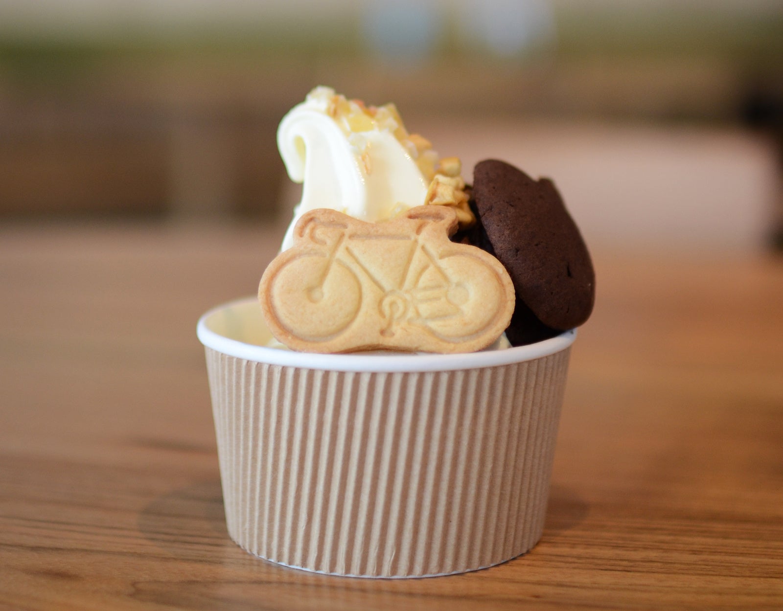 GO!GO!千曲川サイクリング限定オリジナルスイーツで、美味しいものがたくさん詰まったお得なスイーツ。正面にのっている「ちゃりクッキー」はオリジナルで焼いていただいているので、ここでしか食べられません!また、季節によってソフトクリームの種類が変わるのでお楽しみに。