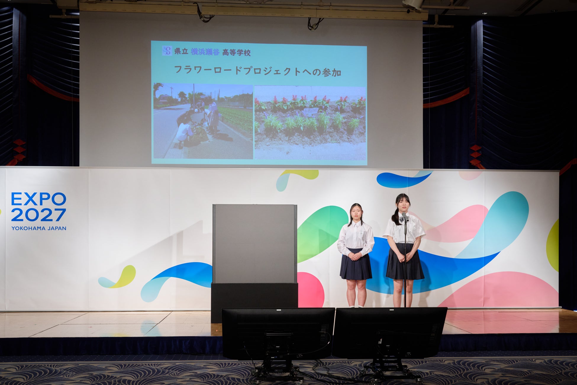 また、この市民参加の先行事例として、神奈川県立横浜瀬谷高等学校(所在地:横浜市瀬谷区)の生徒が登壇。本博覧会の会場となる旧上瀬谷通信施設跡地までの海軍道路1.5キロメートルの沿道に花を植栽する活動「フラワーロードプロジェクト」について紹介しました。