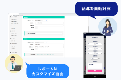 業務報告の集計にあたって、管理者はスタッフへの設問を案件ごとに自由にカスタマイズできます。実働時間の報告から給与を自動計算し、勤務実績はCSV等で管理ページからエクスポートが可能です。