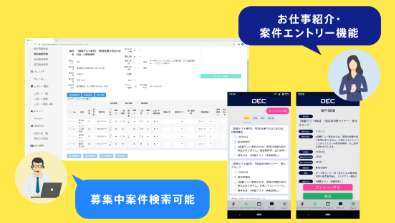 アプリから募集中の案件を探し、そのままエントリーすることが可能。管理者からは募集案件を一斉配信し、スタッフにプッシュ通知でお知らせ。また、スタッフの登録情報をもとに、管理者は案件にマッチした人材を検索できます。
