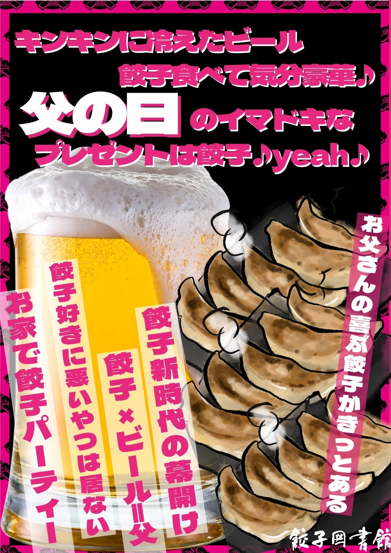 餃子をつまみにお父さんと語ろう6月13~19日は餃子図書館“父の日ウィーク”通常1,200円の餃子がALL1,000円に。
