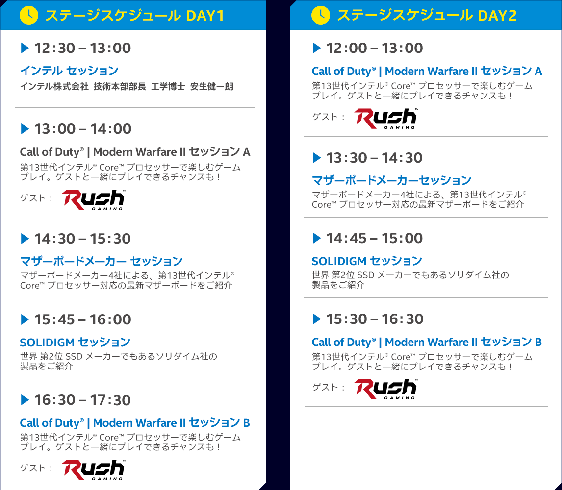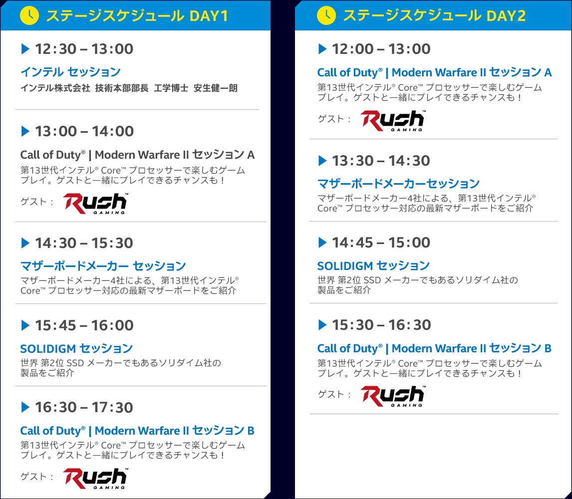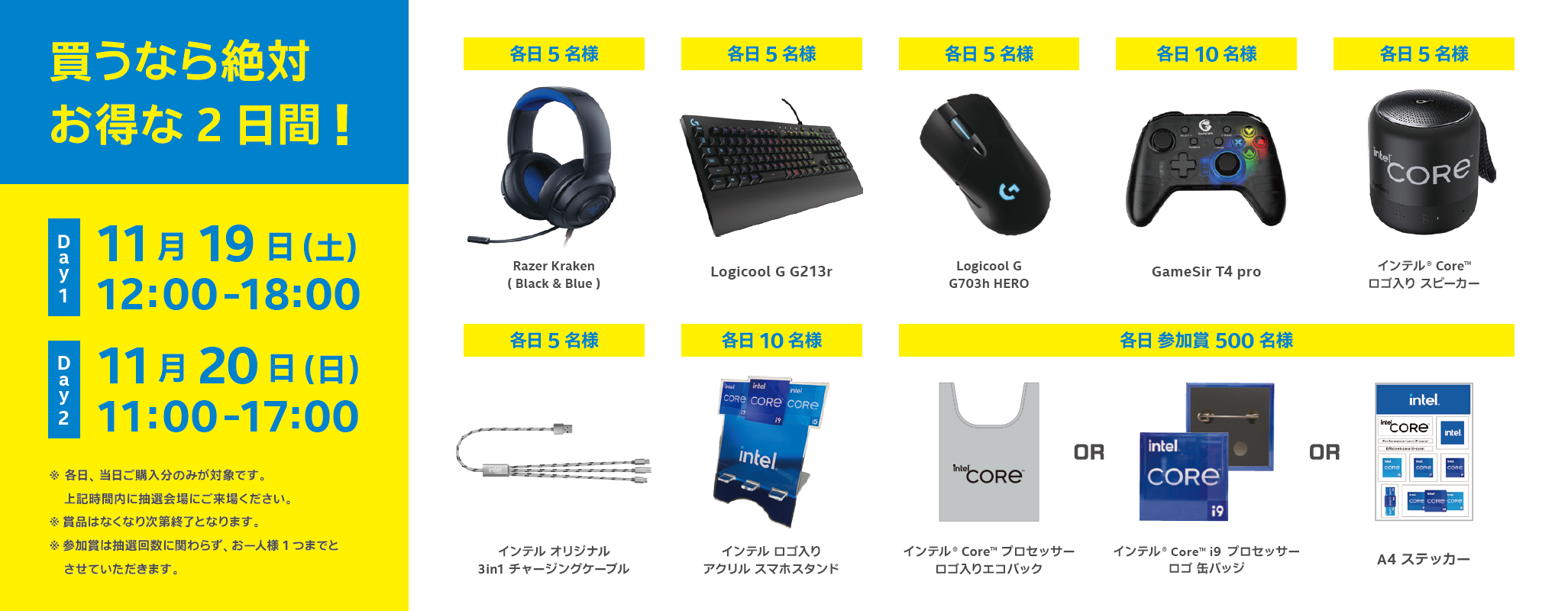 11月19日(土)と20日(日)の2日間、東京・秋葉原のAKIBA SQUAREにて第13世代インテル® Core™ プロセッサーのパフォーマンスを体験いただけるコーナーやゲストを招いたステージを実施。オリジナルマウスパッドが先着でもらえるキャンペーンや、当日のお買い物で豪華賞品が当たる抽選会も同時開催!