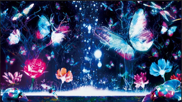 「昆虫の楽園」をテーマにしたプロジェクションマッピング演出では、幻想的な森の中で、宝石のように光り輝く昆虫たちが飛び交うデジタルアート空間を体感できます。
