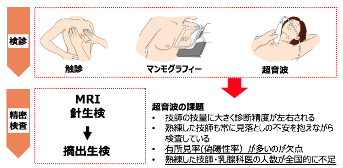 一方、エコー検査は、検査担当者の技量により精度のばらつきが生じてしまう点が課題とされてきました。乳がん検診の精度管理は、日本乳がん検診精度管理中央機構(精中機構)が中心に行なわれていますが、学会でAIを活用した乳がん診断のシンポジウムが多数開催されるなど、AIを活用した精度向上が期待されています。